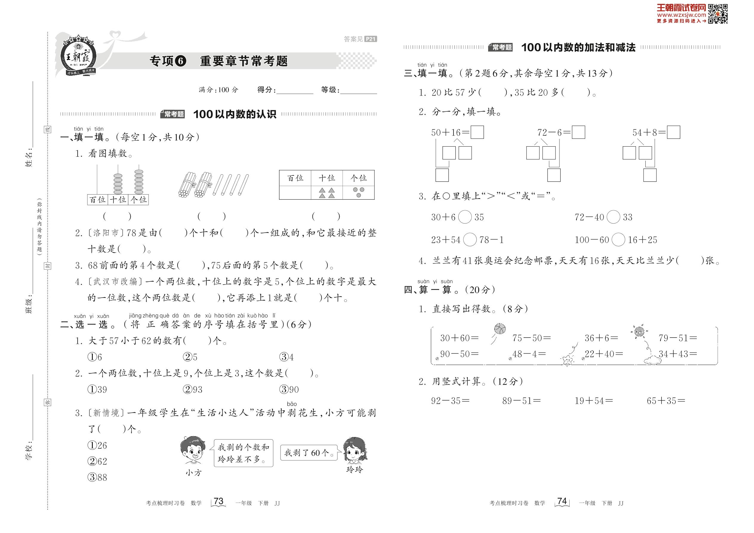 2023下册一年级数学冀教版 专项6 重要章节常考题