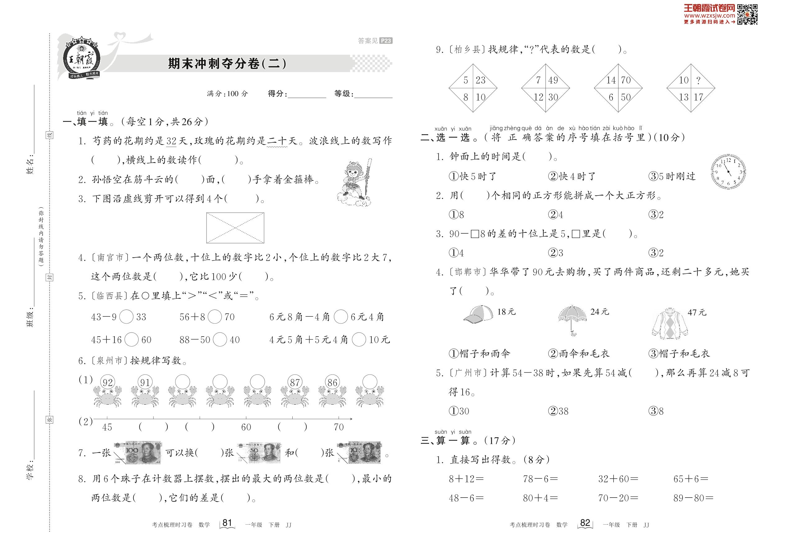 2023下册一年级数学冀教版 期末冲刺夺分卷(二)