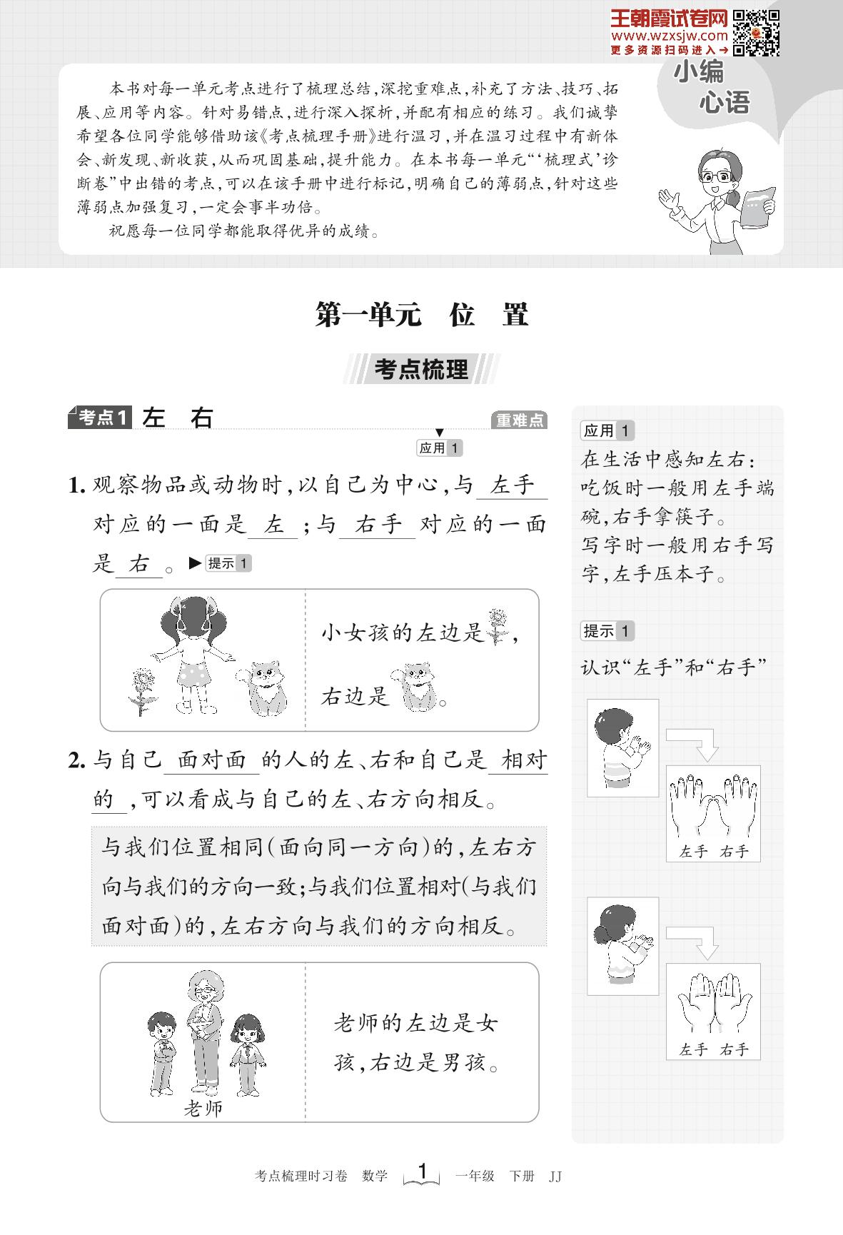 2023下册一年级数学冀教版 考点梳理手册——第一单元 位置