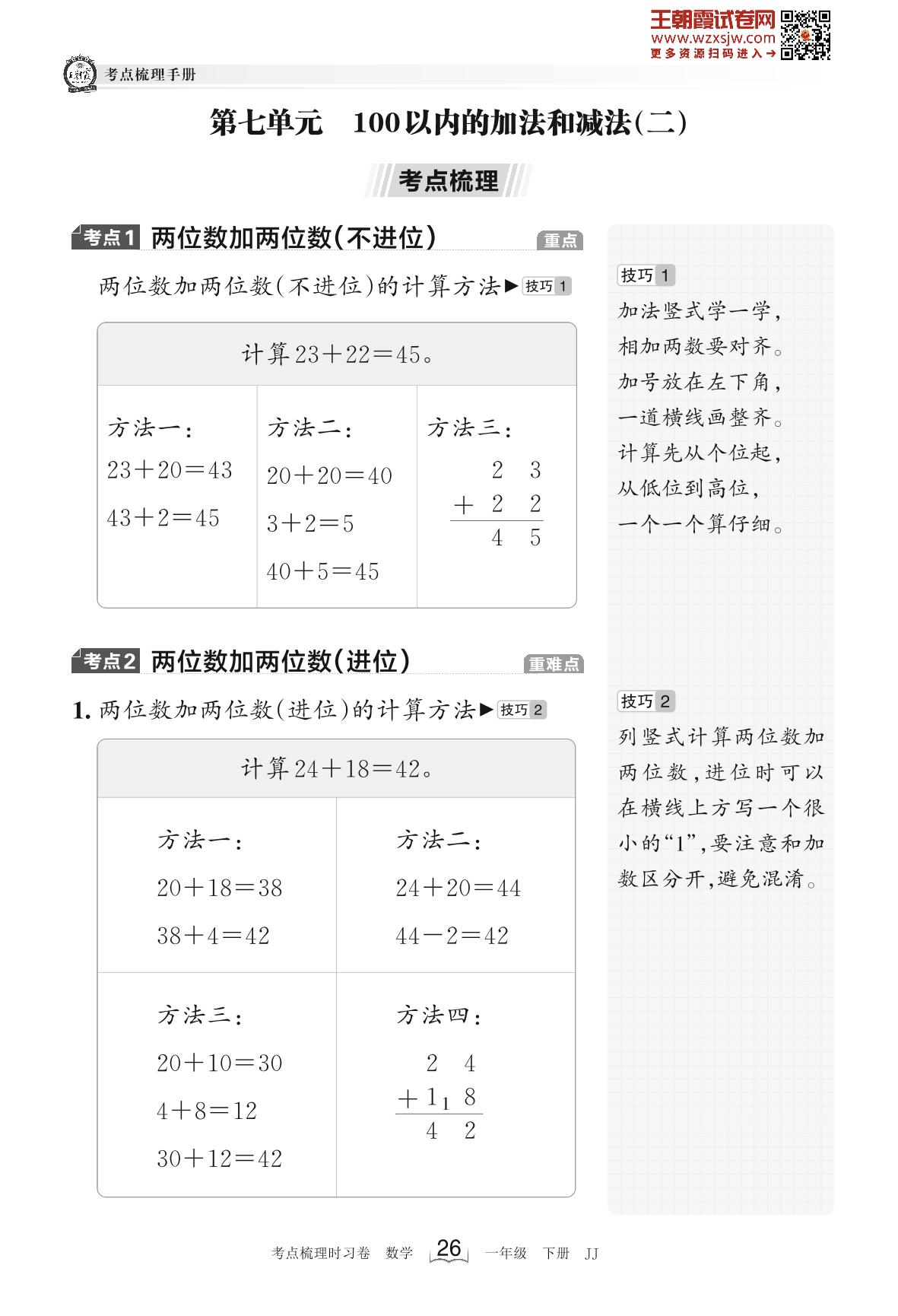 2023下册一年级数学冀教版 考点梳理手册——第七单元 100以内的加法和减法(二)