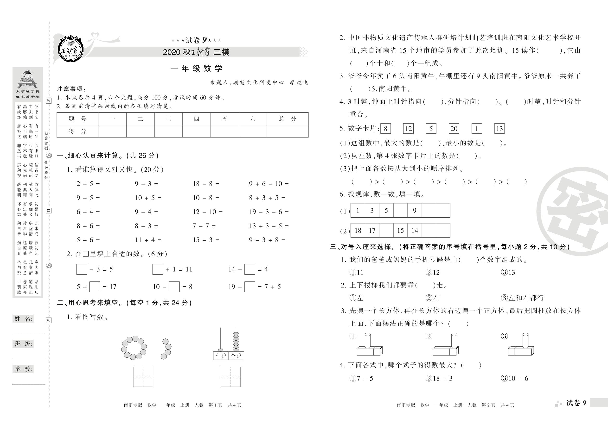 王朝霞期末模拟卷一年级上册数学(人教版)_R210802211544【9】