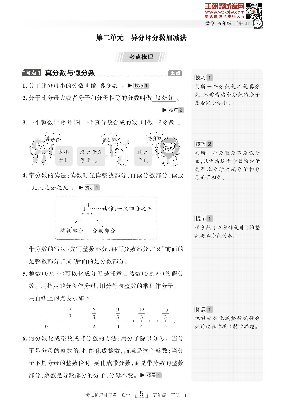 2023下册五年级数学冀教版 考点梳理手册——第二单元 异分母分数加减法
