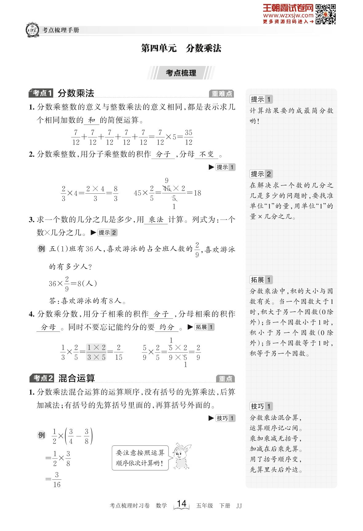 2023下册五年级数学冀教版 考点梳理手册——第四单元 分数乘法