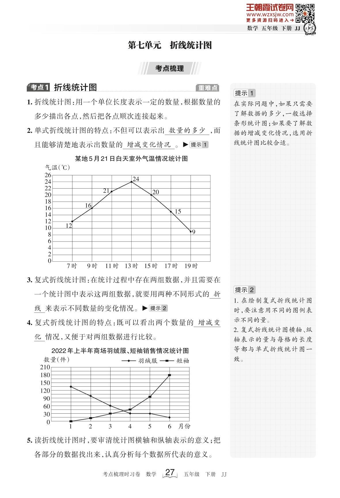 2023下册五年级数学冀教版 考点梳理手册——第七单元 折线统计图