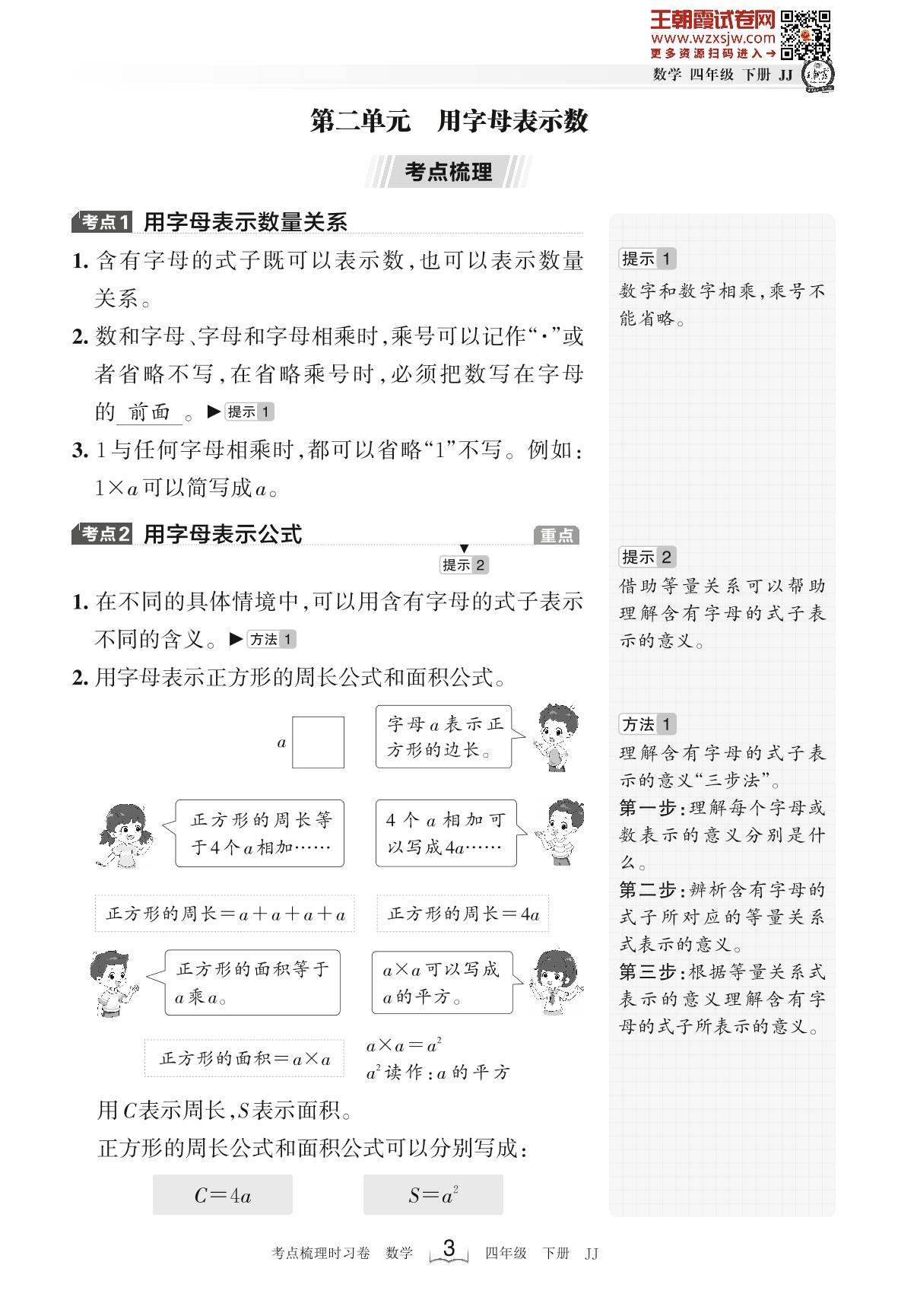 2023下册四年级数学冀教版 考点梳理手册——第二单元 用字母表示数