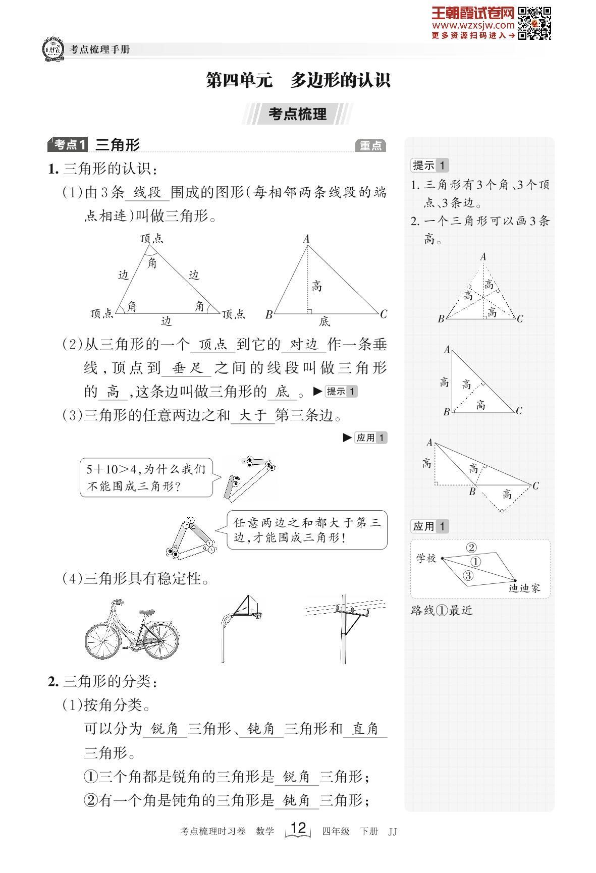 2023下册四年级数学冀教版 考点梳理手册——第四单元 多边形的认识