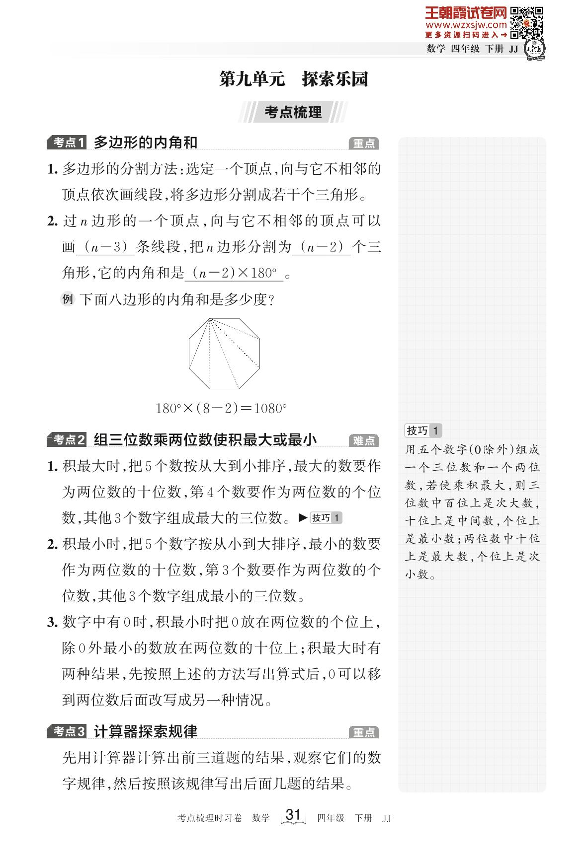 2023下册四年级数学冀教版 考点梳理手册——第九单元 探索乐园