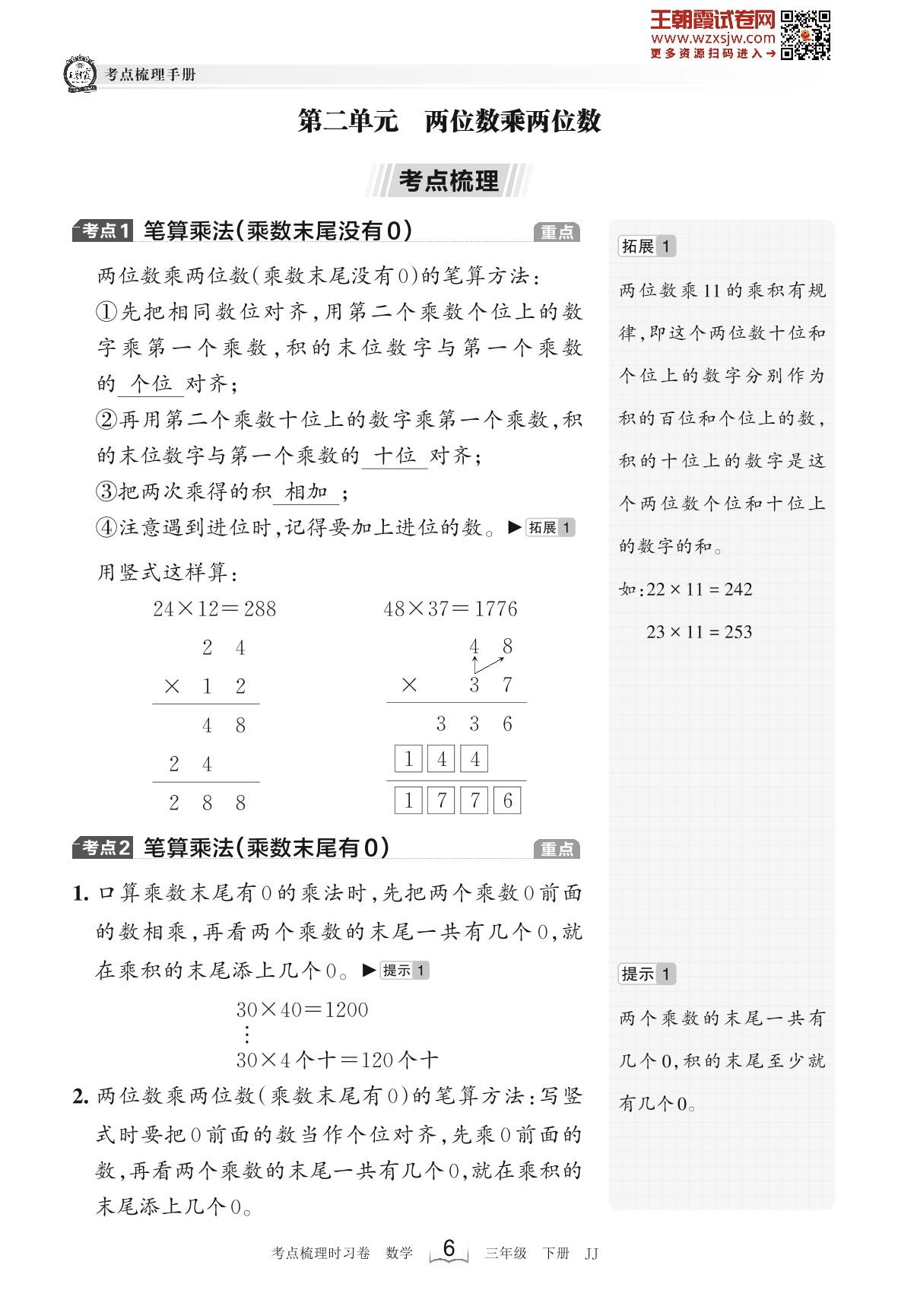 2023下册三年级数学冀教版 考点梳理手册——第二单元 两位数乘两位数