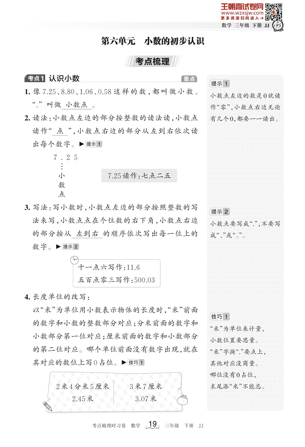 2023下册三年级数学冀教版 考点梳理手册——第六单元 小数的初步认识