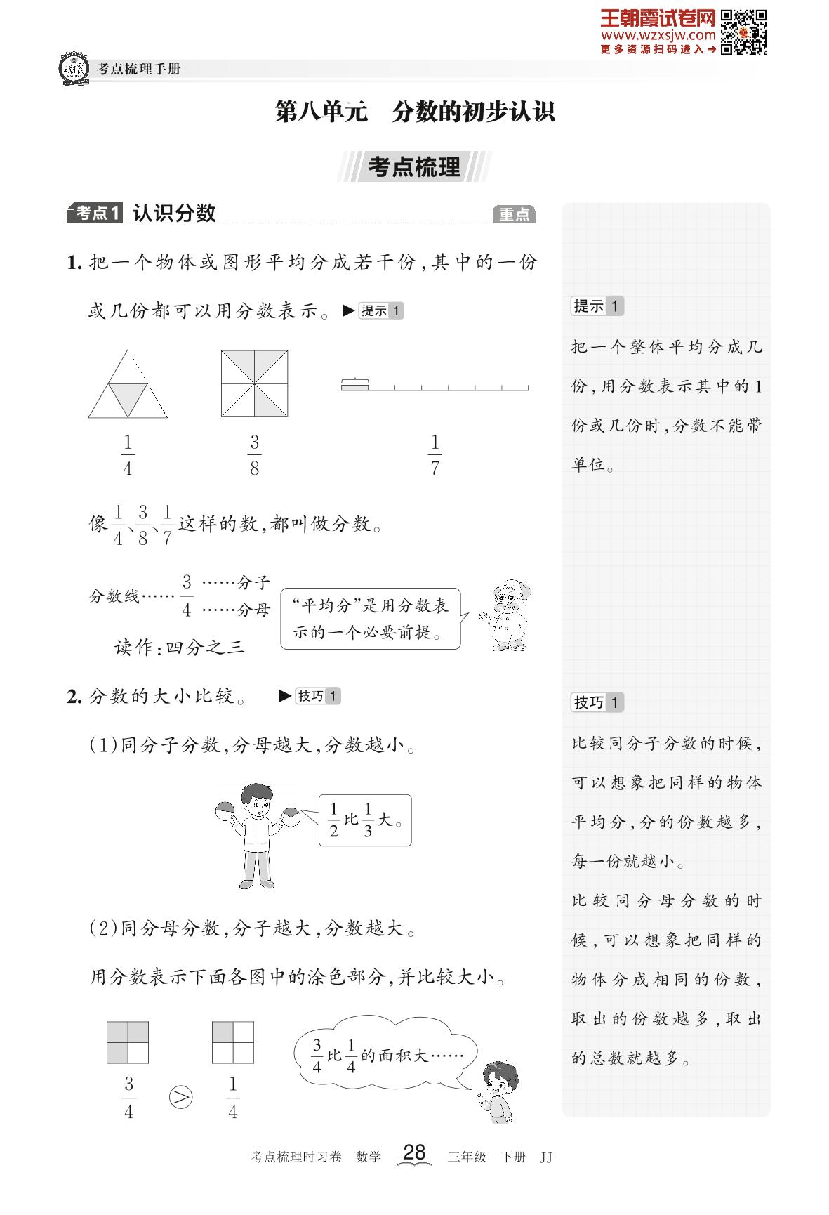 2023下册三年级数学冀教版 考点梳理手册——第八单元 分数的初步认识
