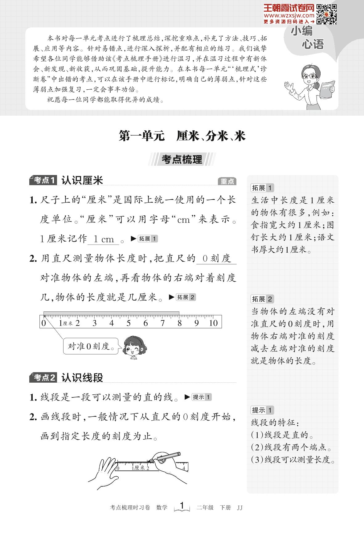 2023下册二年级数学冀教版 考点梳理手册——第一单元 厘米、分米、米