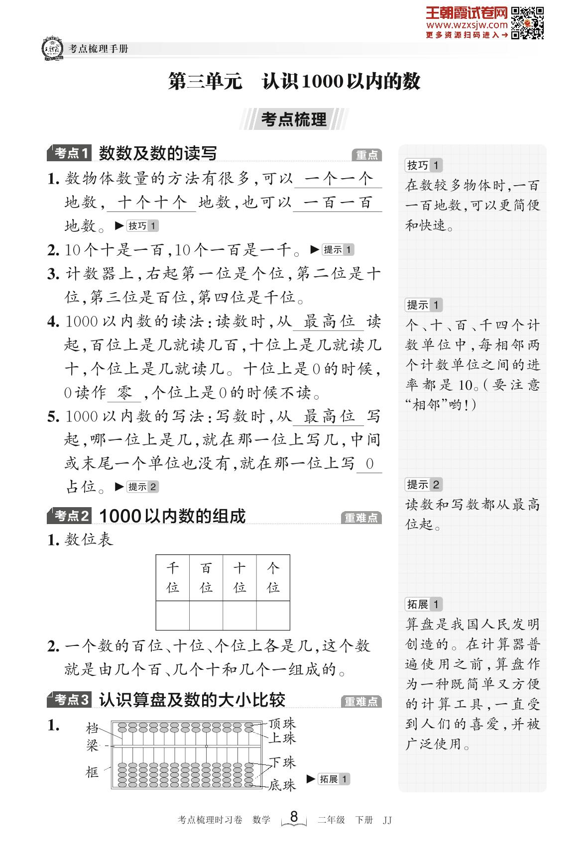 2023下册二年级数学冀教版 考点梳理手册——第三单元 认识1000以内的数
