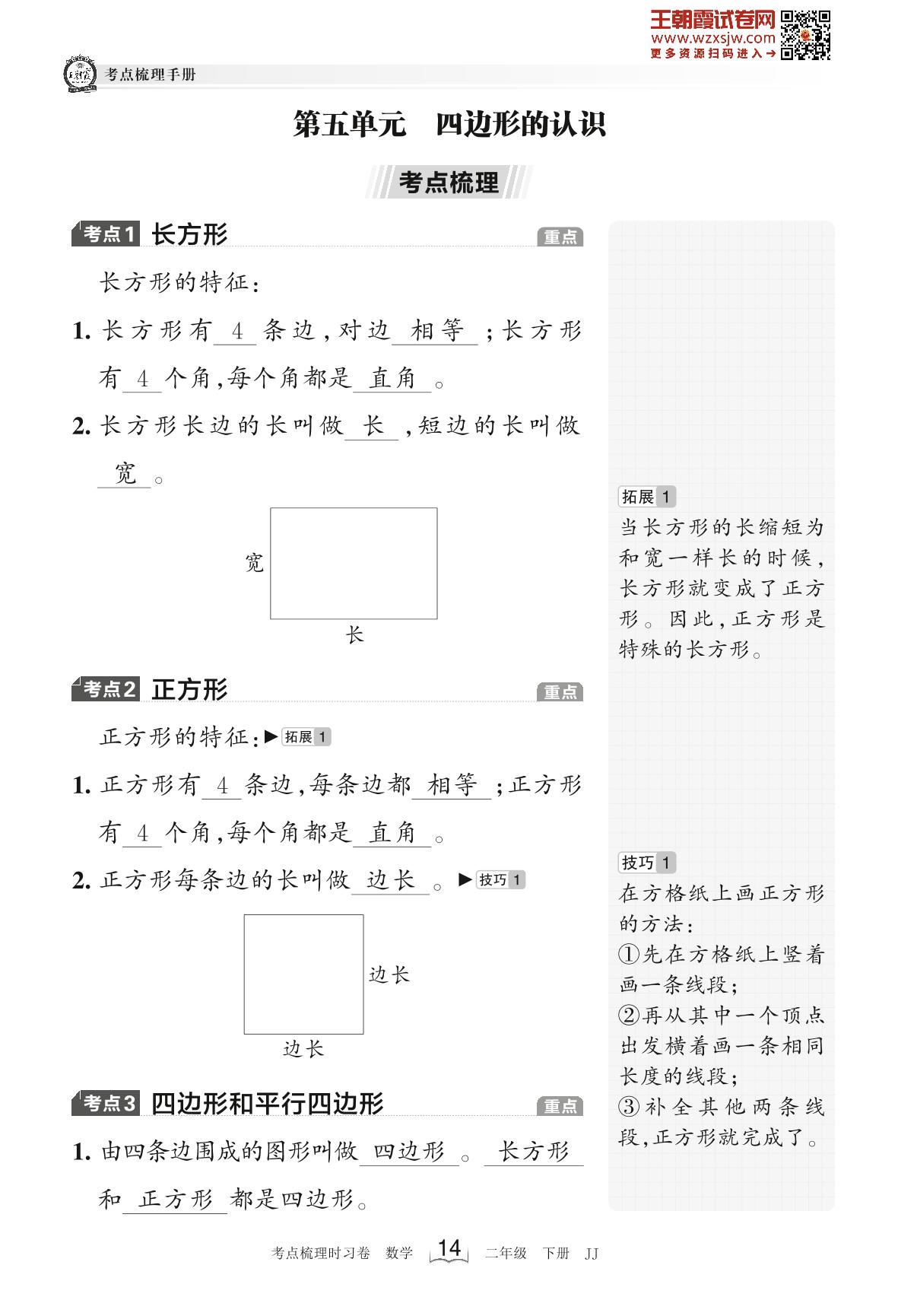 2023下册二年级数学冀教版 考点梳理手册——第五单元 四边形的认识