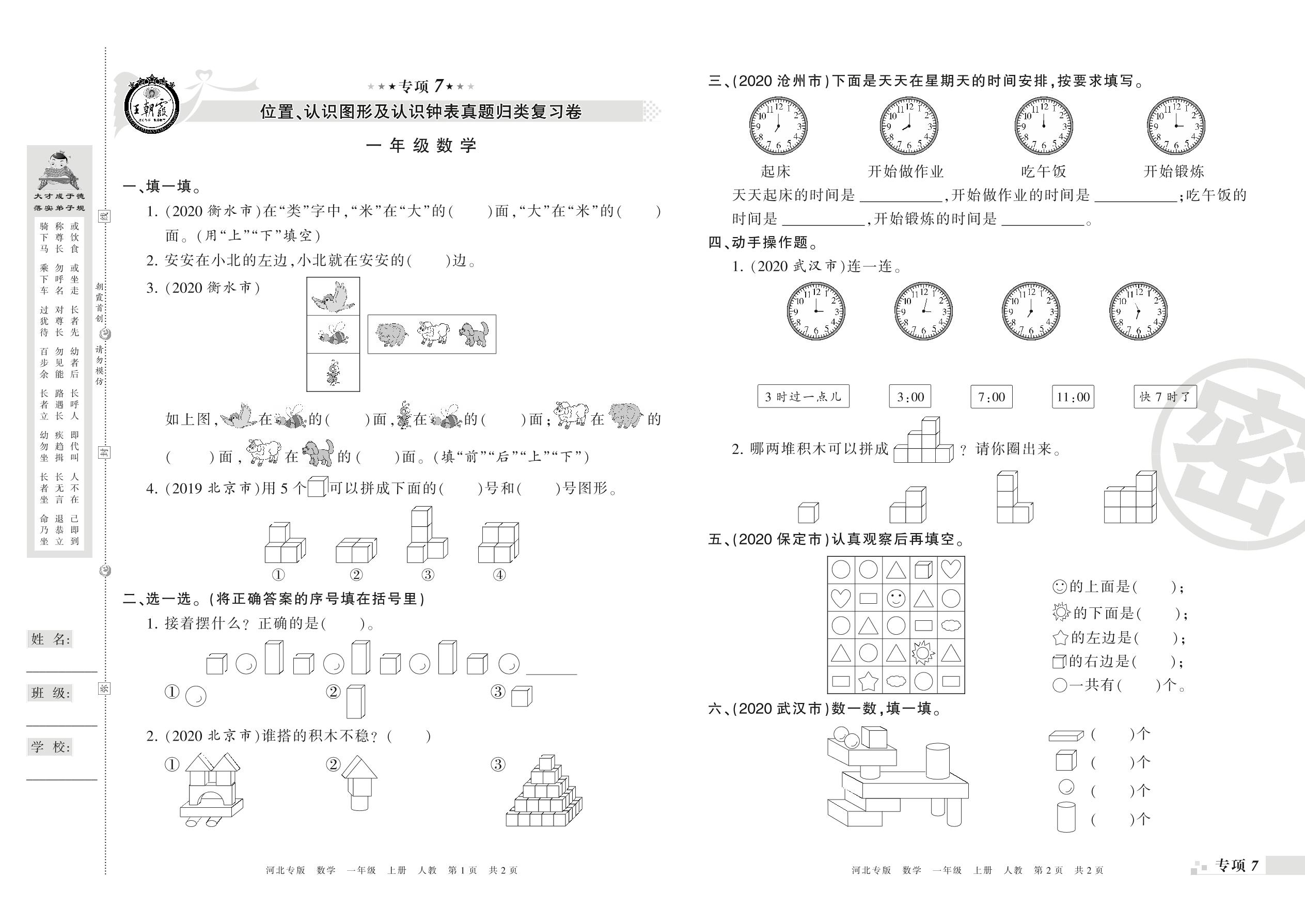 王朝霞期末专项卷——位置、认识图形及认识钟表真题归类复习、新颖题速递:生活与数学一年级上册数学(人教版)【0】