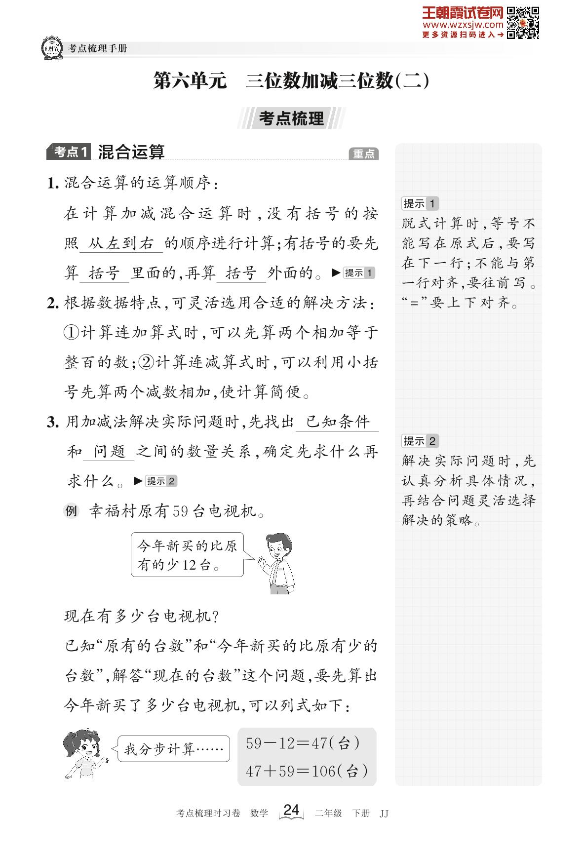 2023下册二年级数学冀教版 考点梳理手册——第六单元 三位数加减三位数(二)