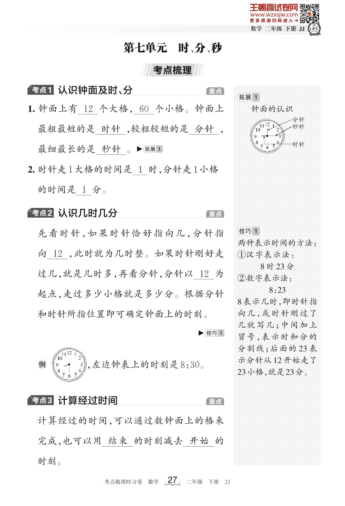 2023下册二年级数学冀教版 考点梳理手册——第七单元 时、分、秒