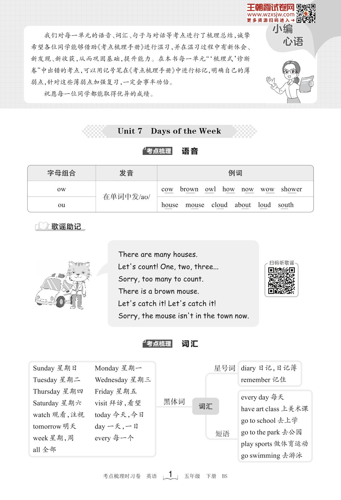 2023下册五年级英语北师版 考点梳理手册——Unit 7 Days of the Week