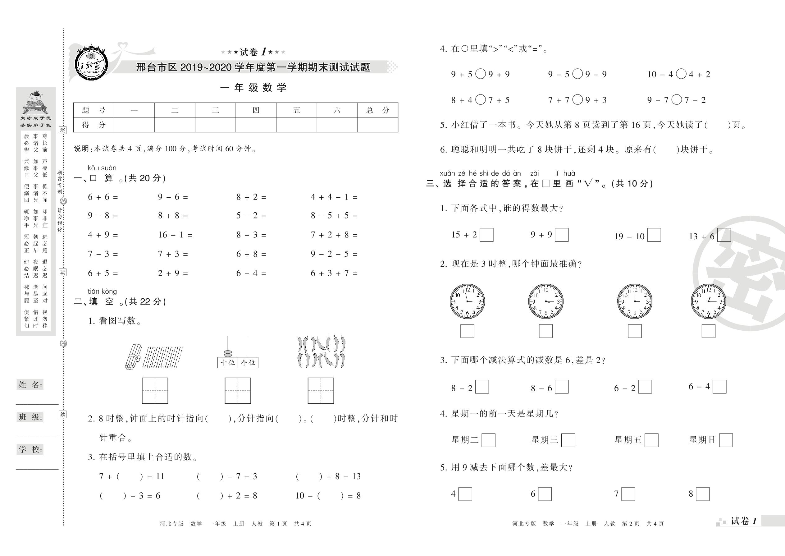2019-2020学年第一学期邢台市区一年级数学试卷(人教版)【1】