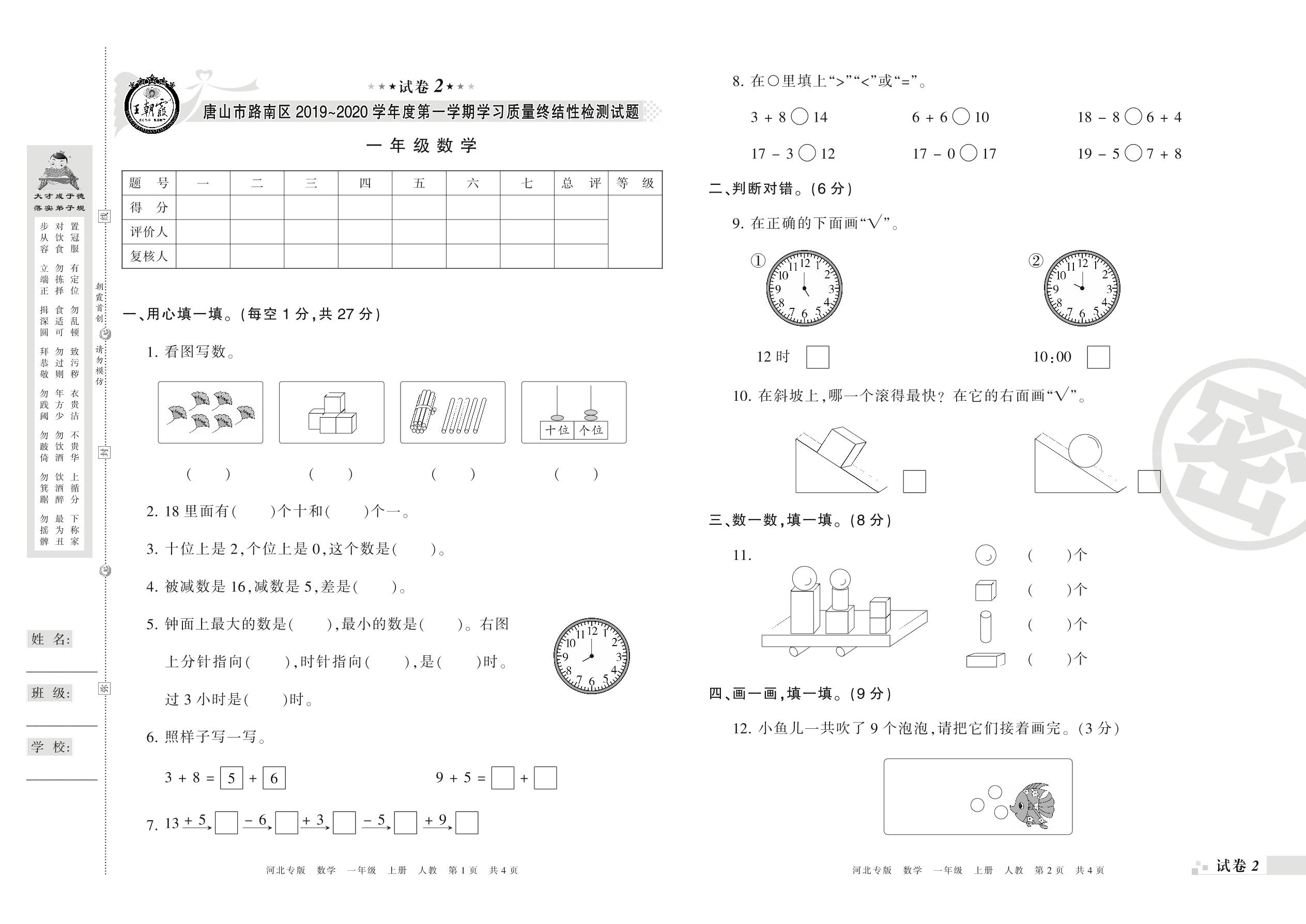 2019-2020学年第一学期唐山市路南区一年级数学试卷(人教版)【2】