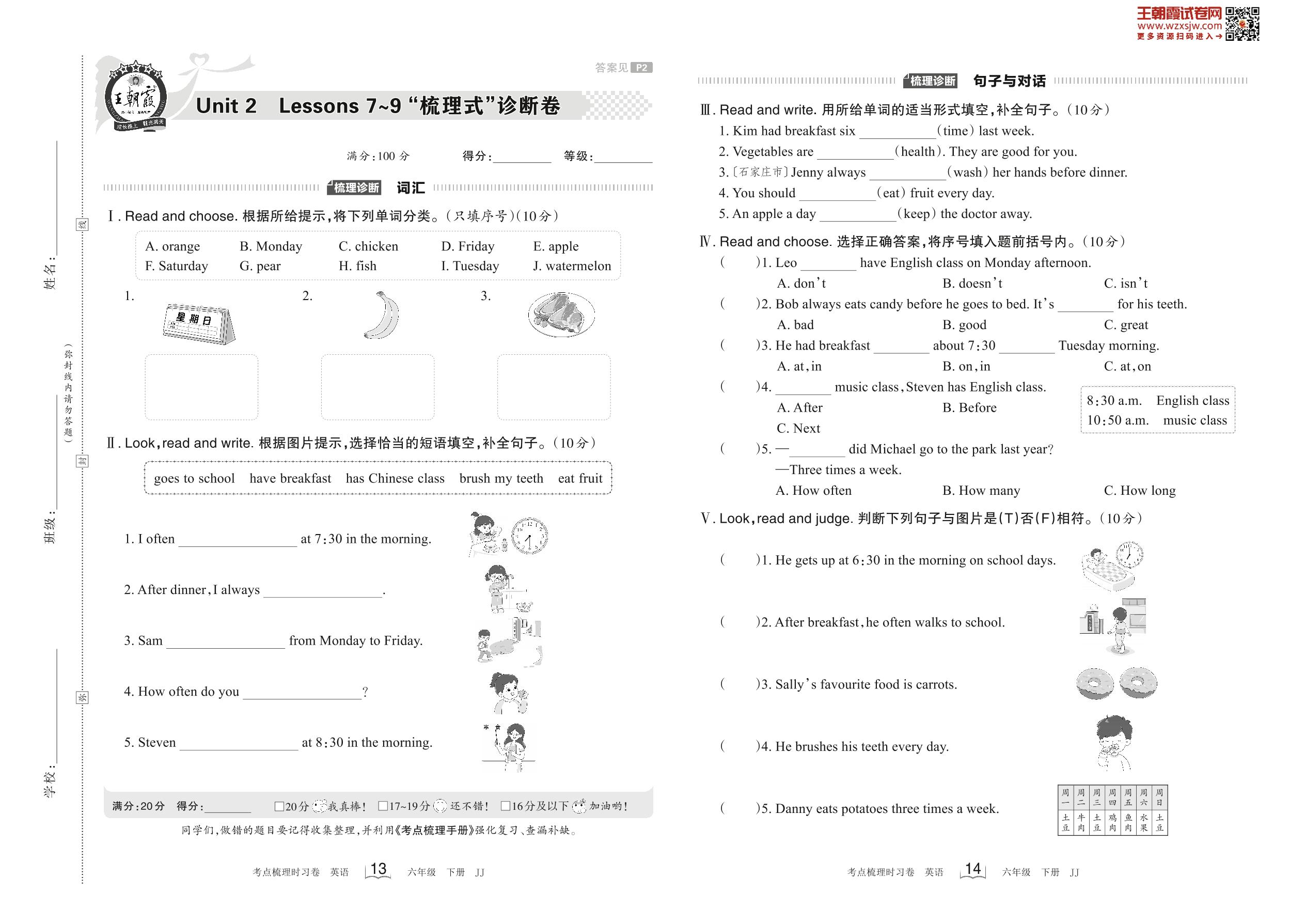 2023下册六年级英语冀教版 Unit 2 Lessons 7~9 “梳理式”诊断卷