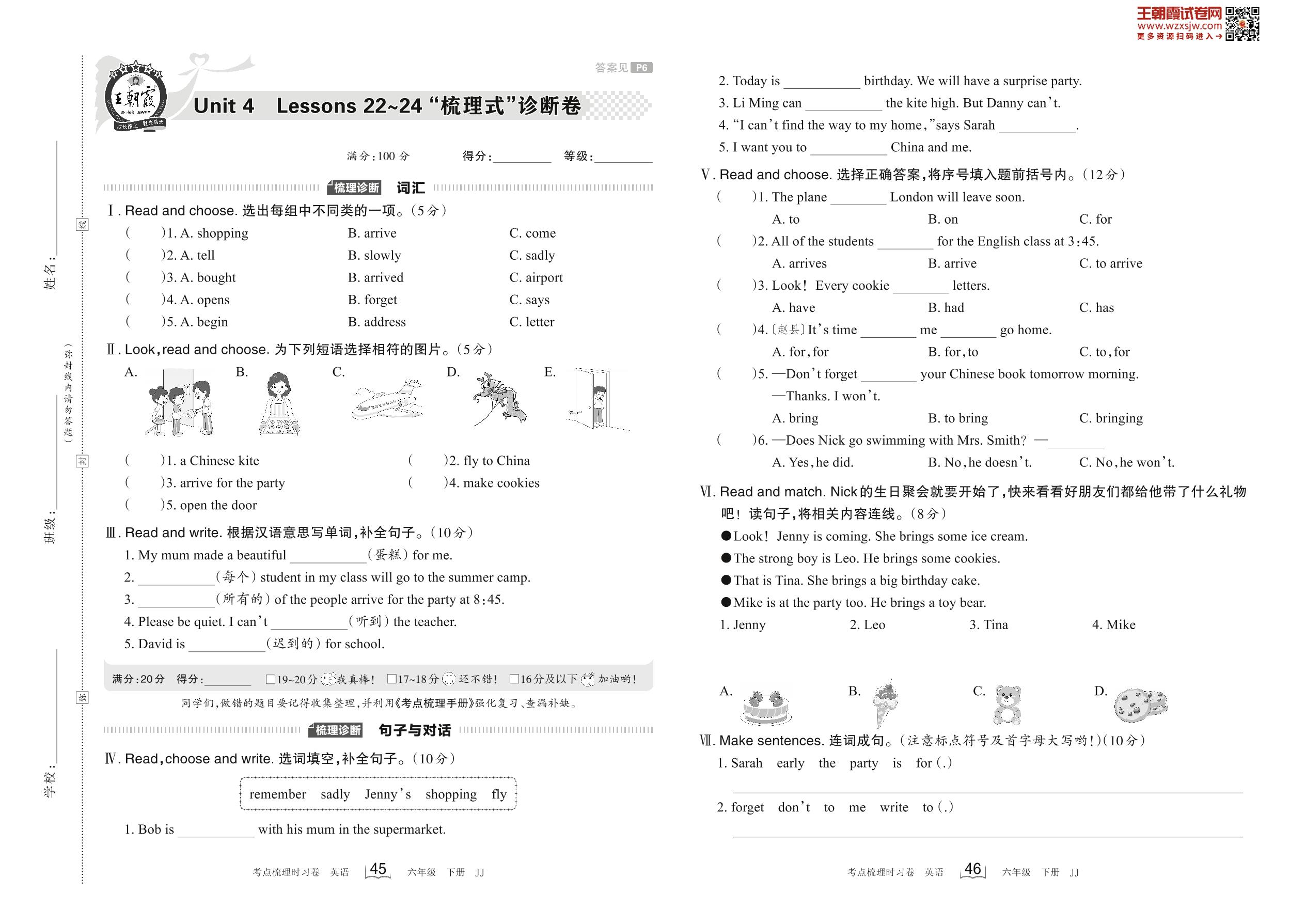 2023下册六年级英语冀教版 Unit 4 Lessons 22~24 “梳理式”诊断卷
