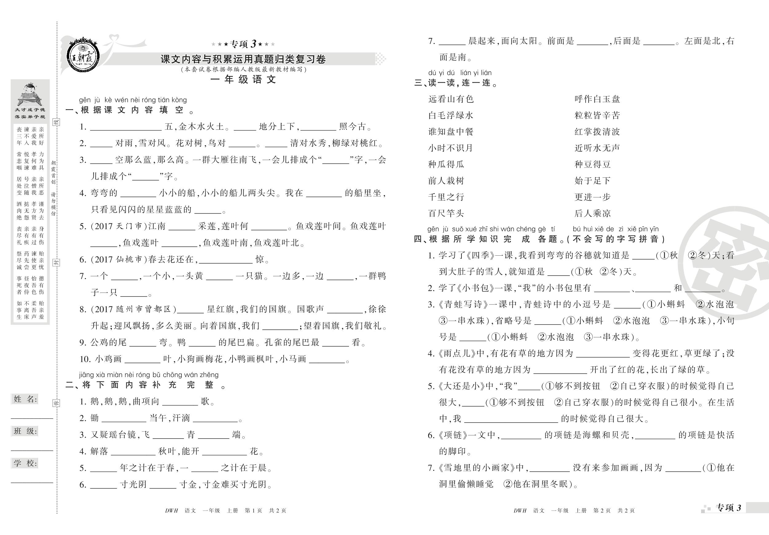 王朝霞期末专项卷——课文内容与积累运用真题归类复习一年级上册语文(人教版)_R210731190306【0】