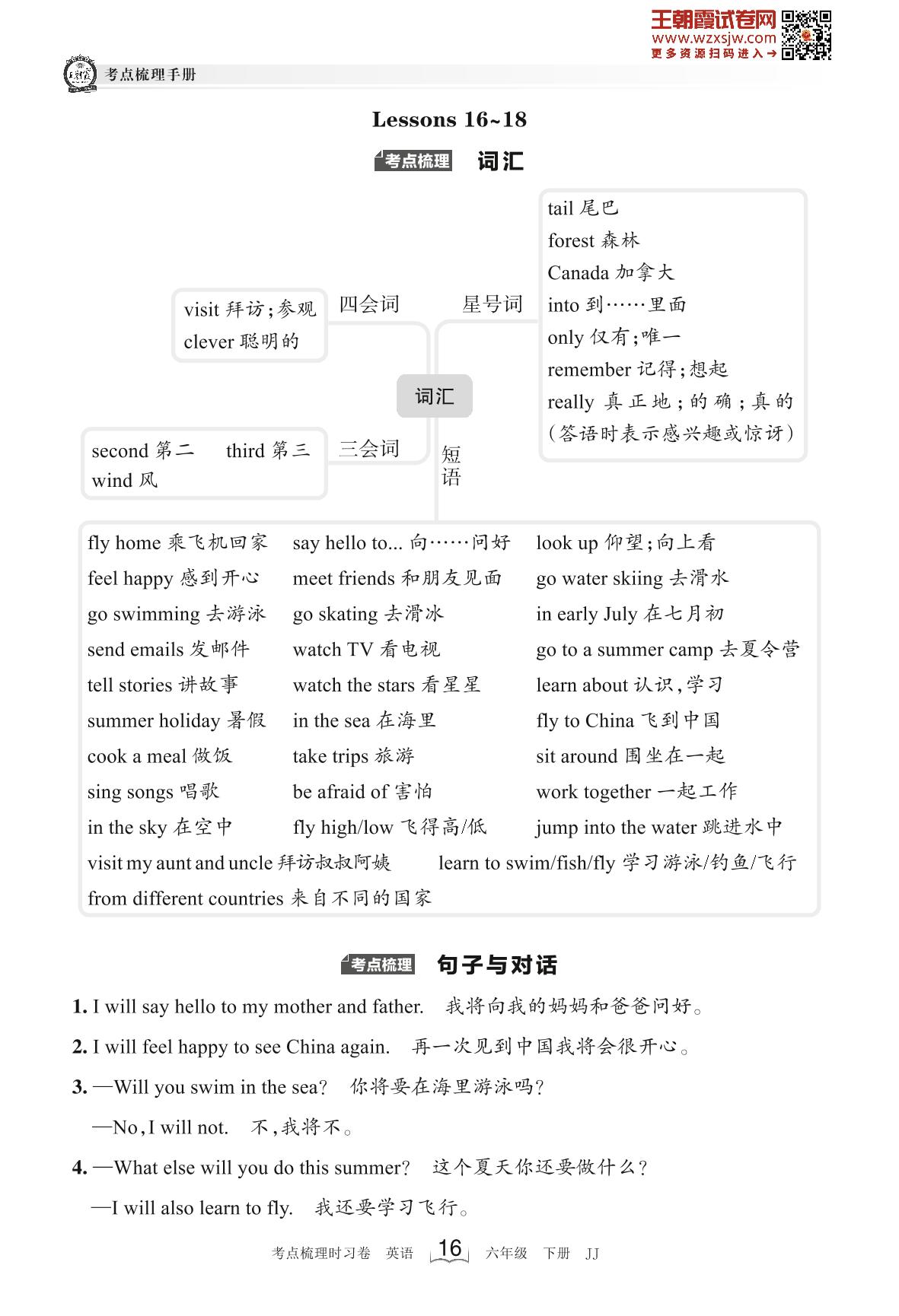 2023下册六年级英语冀教版 考点梳理手册——Unit 3 Lessons 16~18