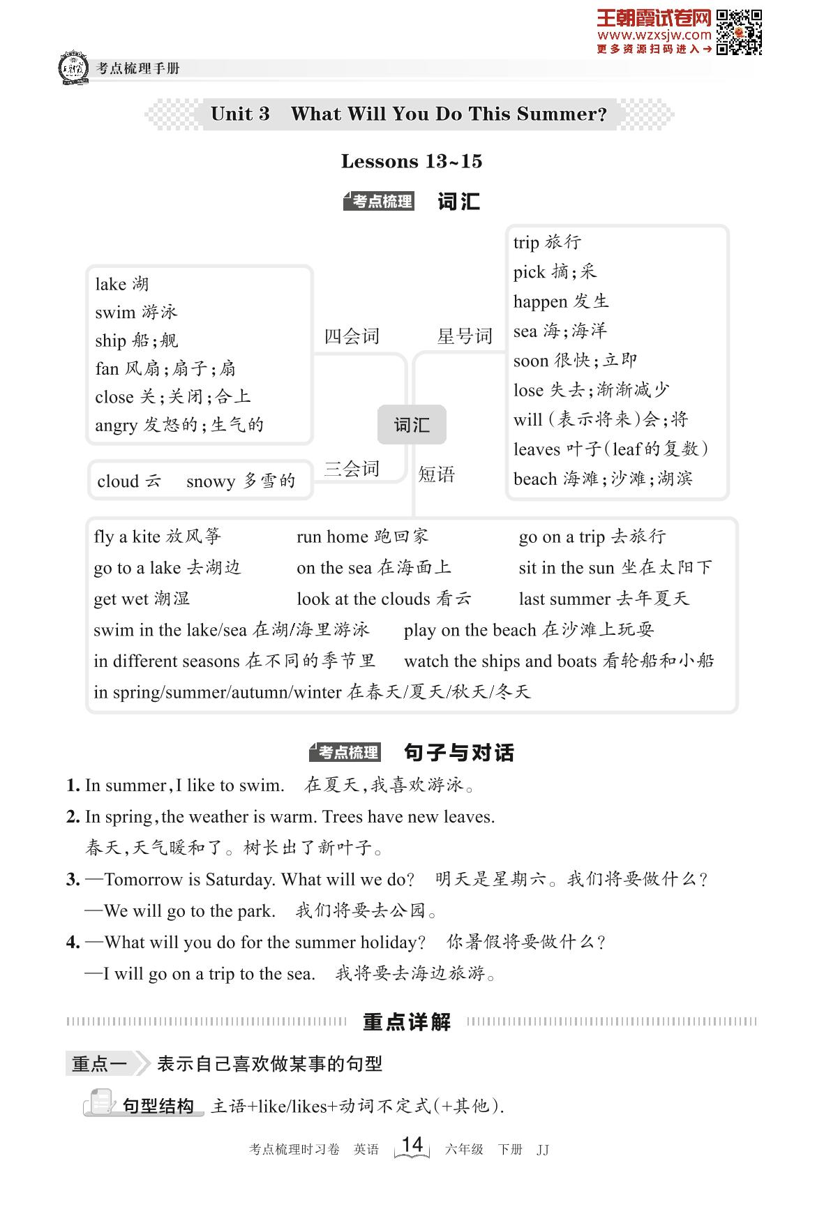 2023下册六年级英语冀教版 考点梳理手册——Unit 3 Lessons 13~15