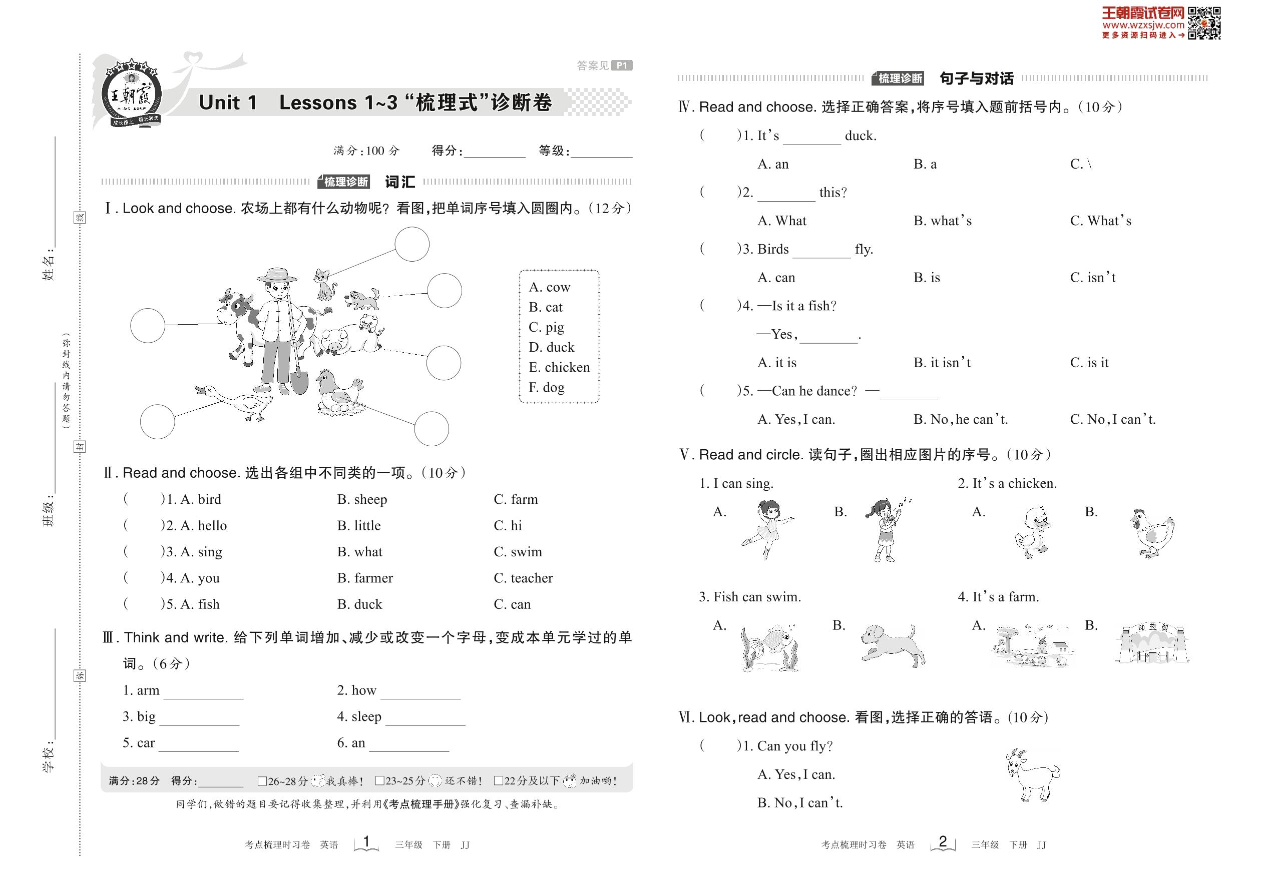 2023下册三年级英语冀教版 Unit 1 Lessons 1~3 “梳理式”诊断卷