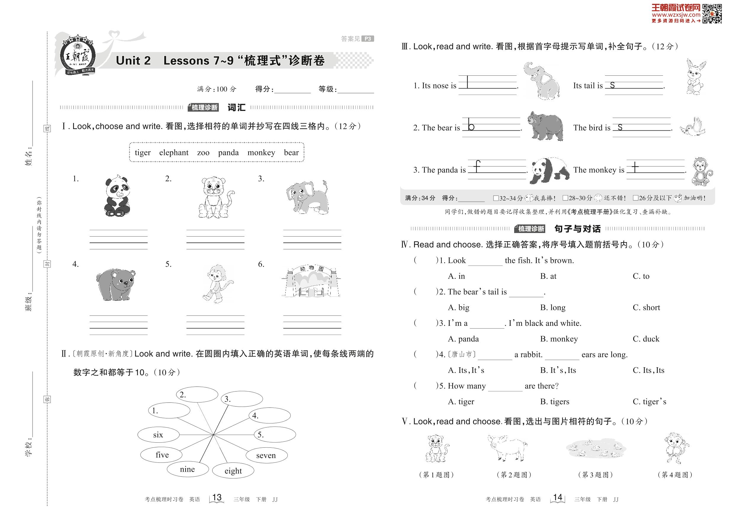 2023下册三年级英语冀教版 Unit 2 Lessons 7~9 “梳理式”诊断卷