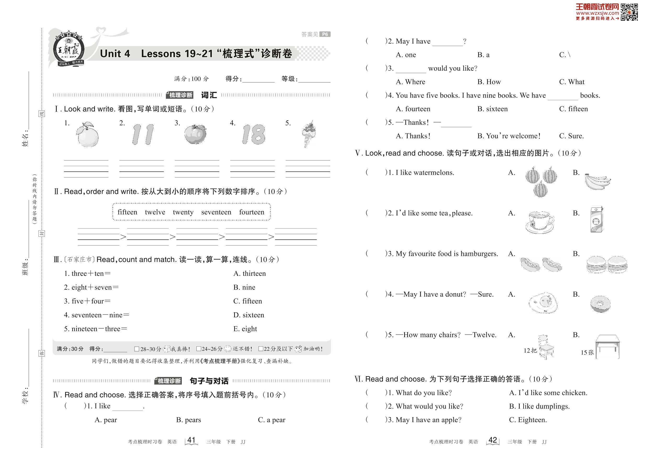 2023下册三年级英语冀教版 Unit 4 Lessons 19~21 “梳理式”诊断卷