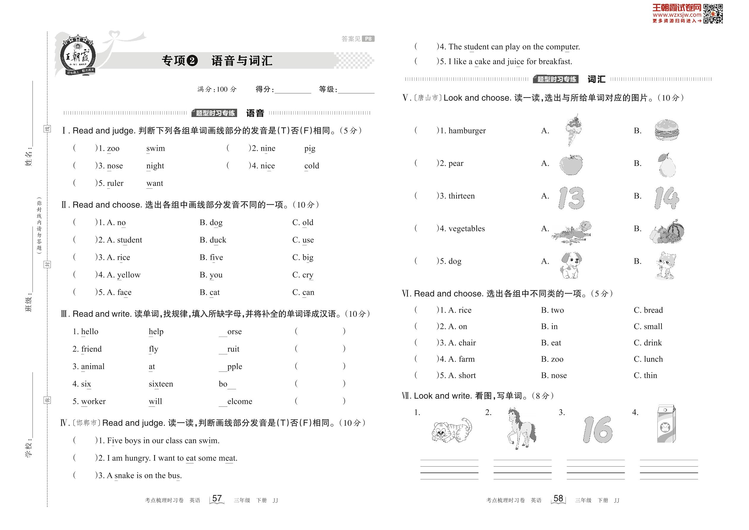 2023下册三年级英语冀教版 专项2 语音与词汇