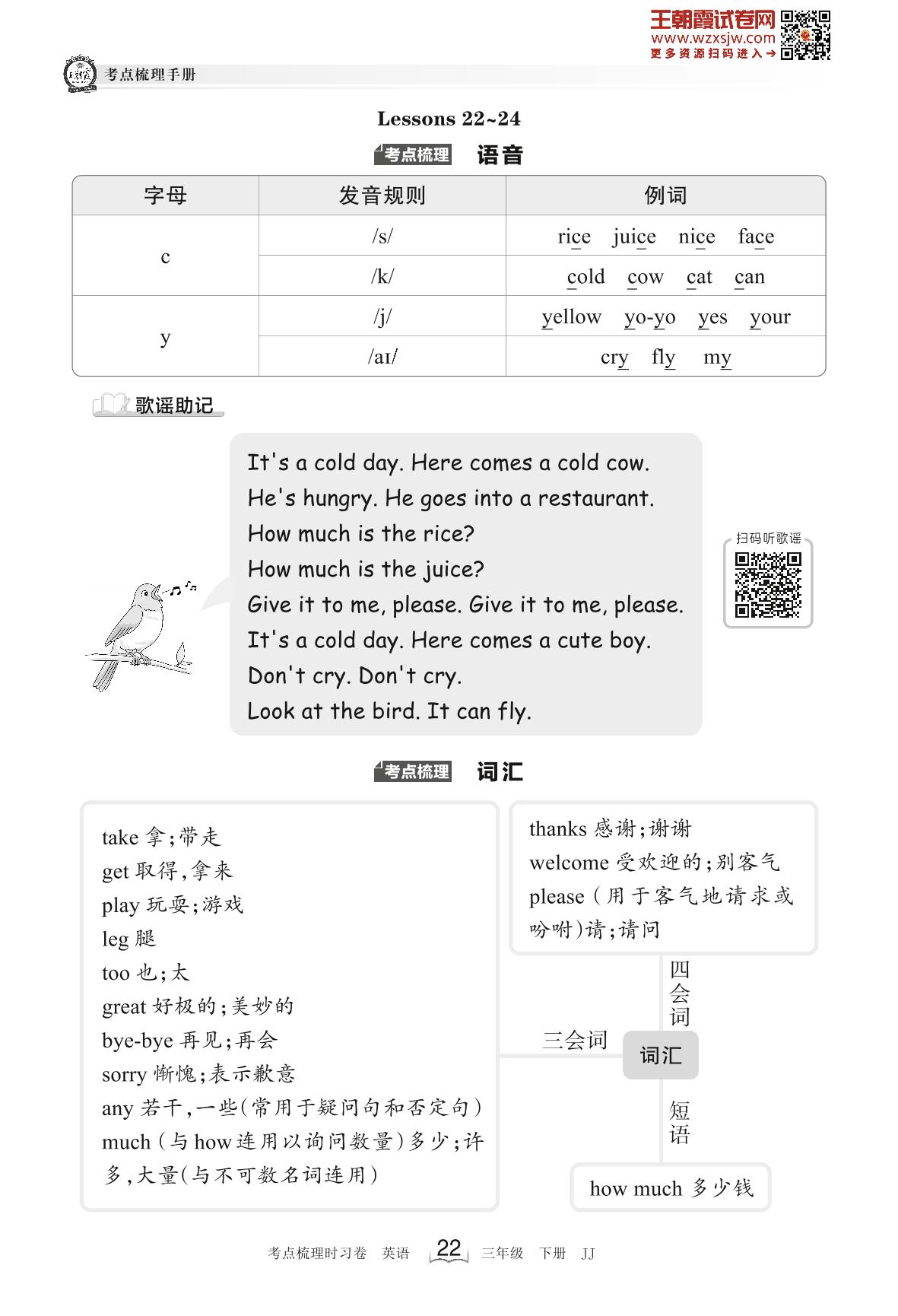 2023下册三年级英语冀教版 考点梳理手册——Unit 4 Lessons 22~24