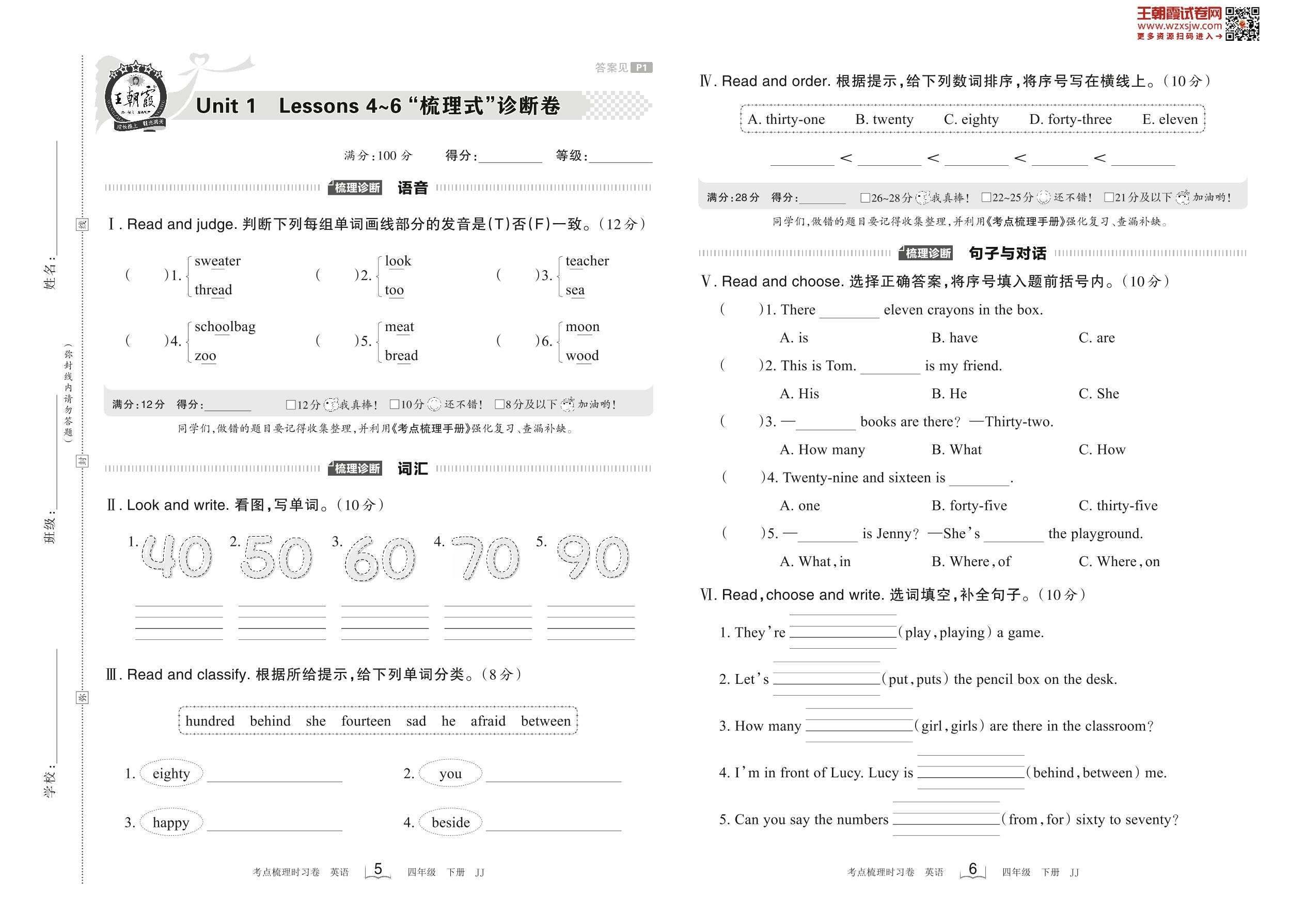 2023下册四年级英语冀教版 Unit 1 Lessons 4~6 “梳理式”诊断卷