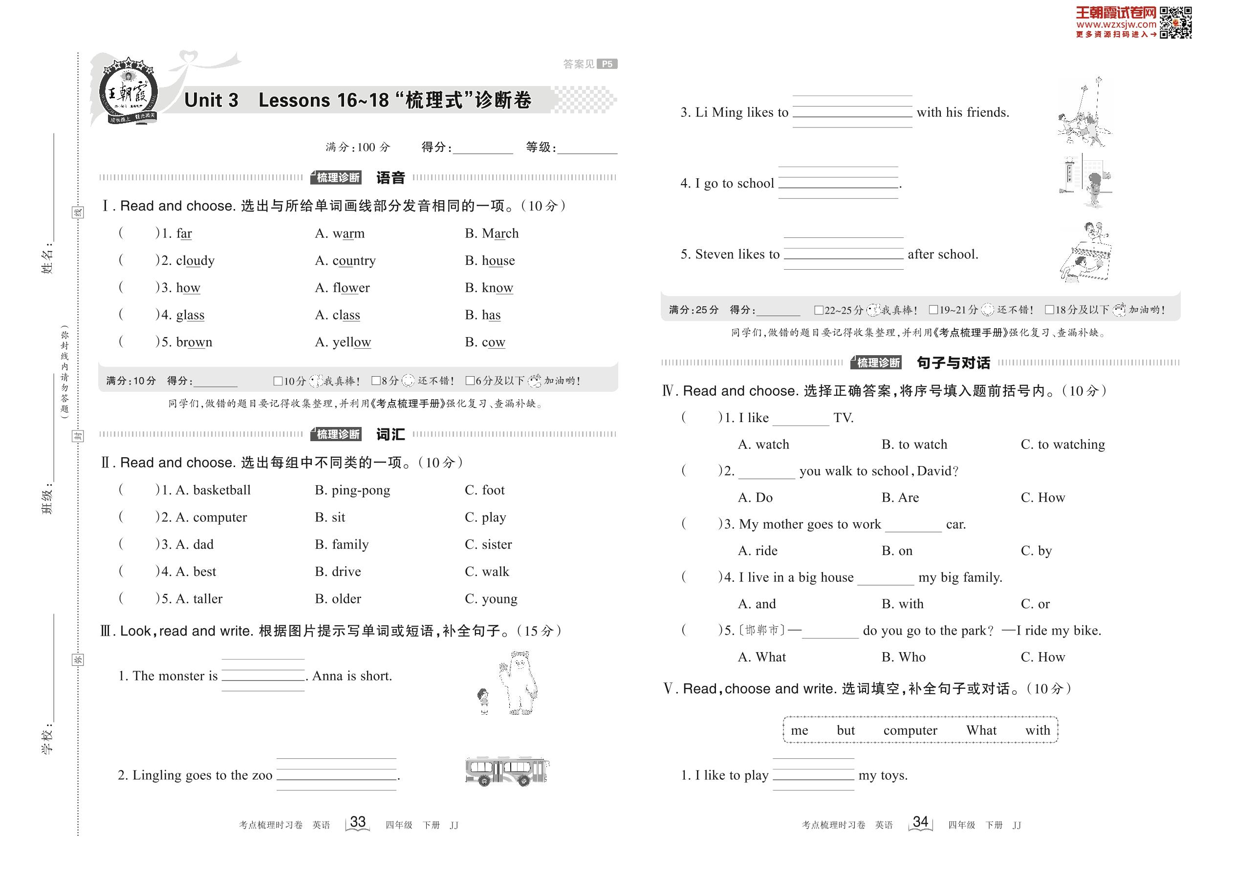 2023下册四年级英语冀教版 Unit 3 Lessons 16~18 “梳理式”诊断卷