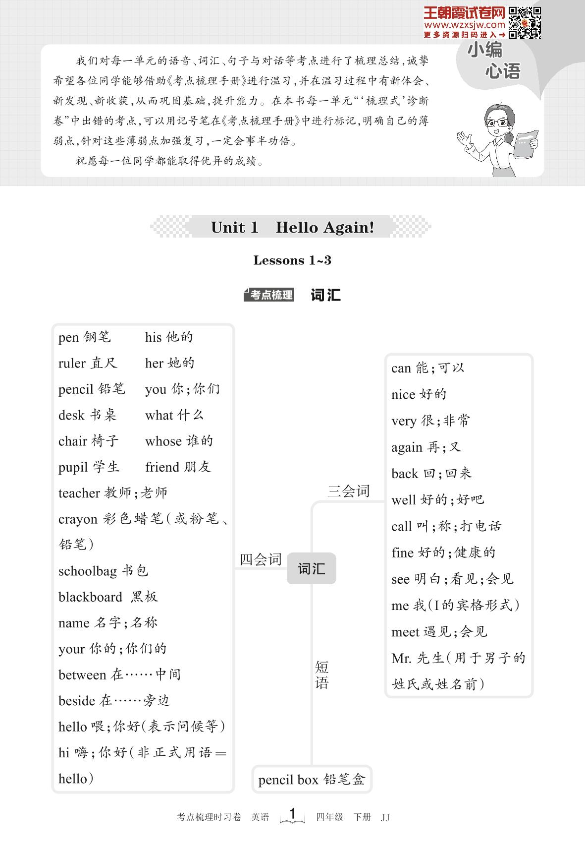 2023下册四年级英语冀教版 考点梳理手册——Unit 1 Lessons 1~3