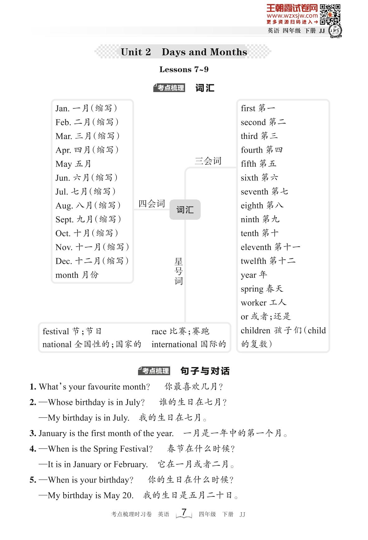 2023下册四年级英语冀教版 考点梳理手册——Unit 2 Lessons 7~9