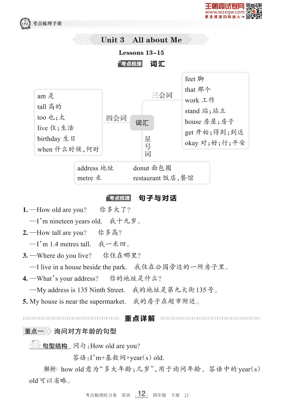 2023下册四年级英语冀教版 考点梳理手册——Unit 3 Lessons 13~15