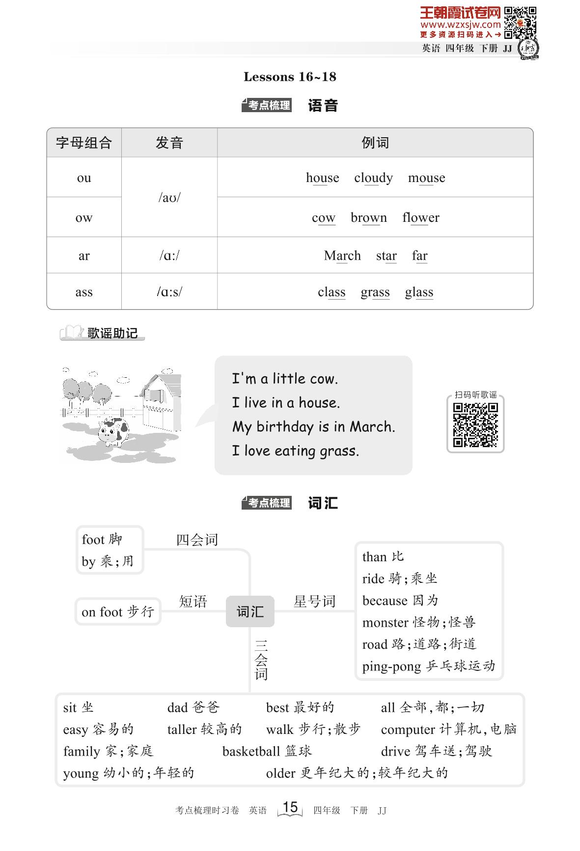 2023下册四年级英语冀教版 考点梳理手册——Unit 3 Lessons 16~18
