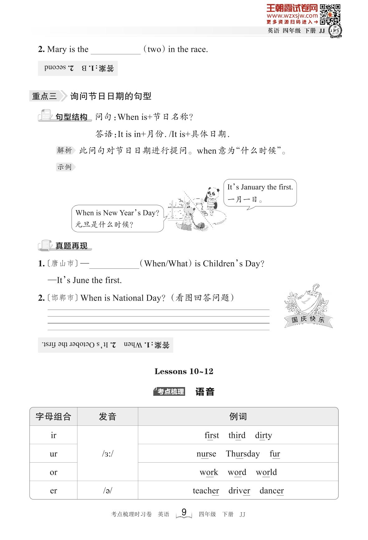 2023下册四年级英语冀教版 考点梳理手册——Unit 2 Lessons 10~12