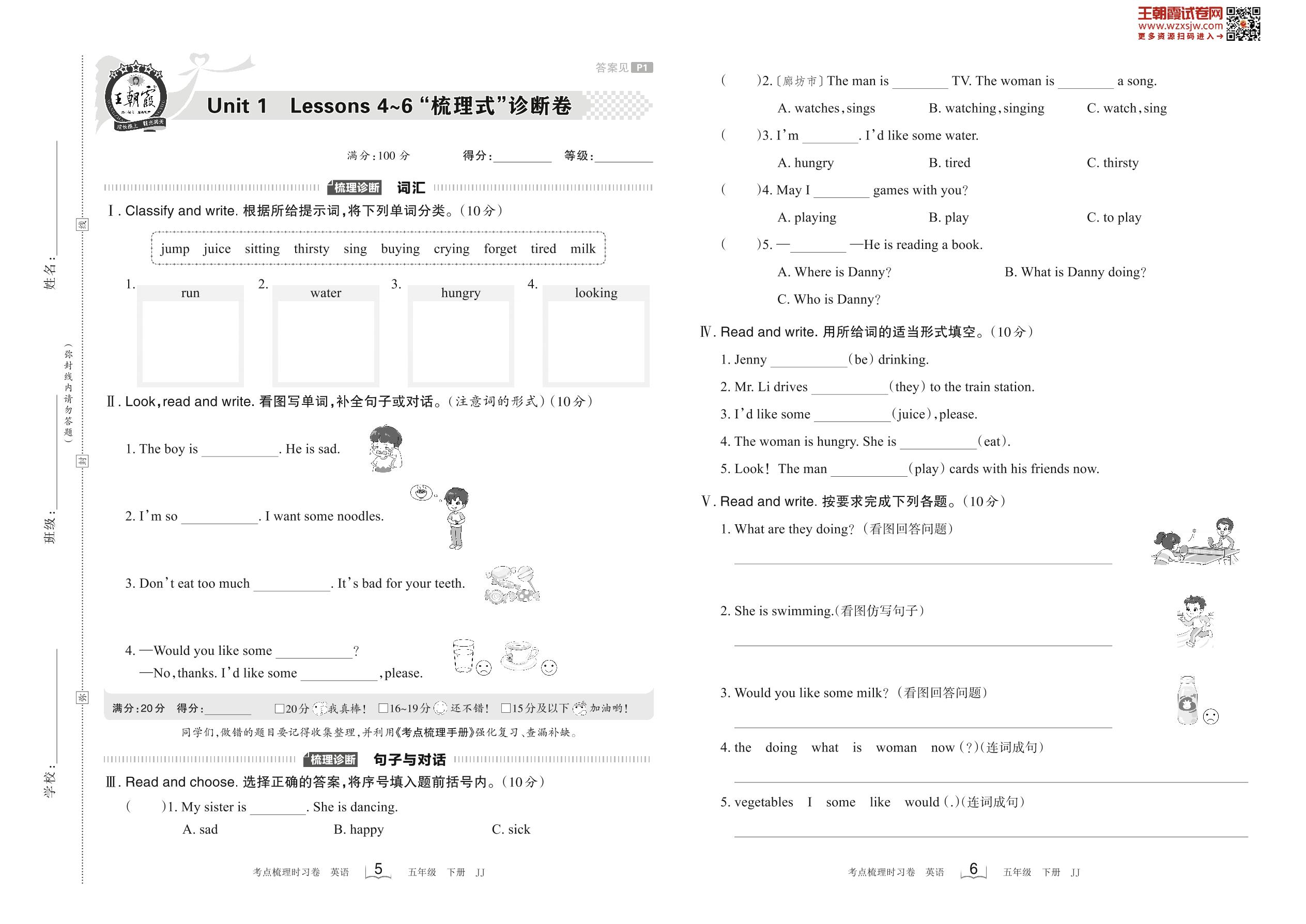 2023下册五年级英语冀教版 Unit 1 Lessons 4~6 “梳理式”诊断卷