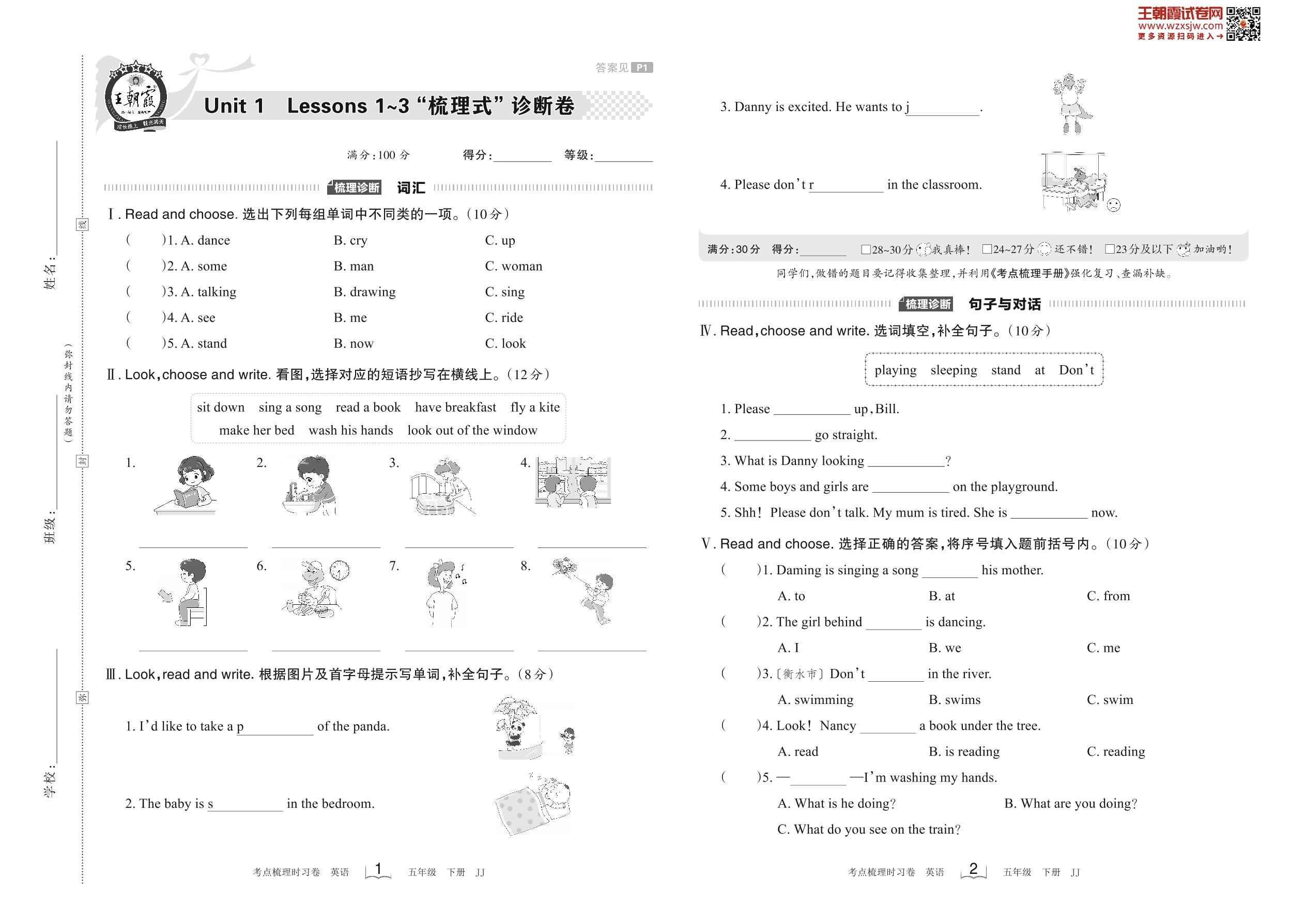 2023下册五年级英语冀教版 Unit 1 Lessons 1~3 “梳理式”诊断卷