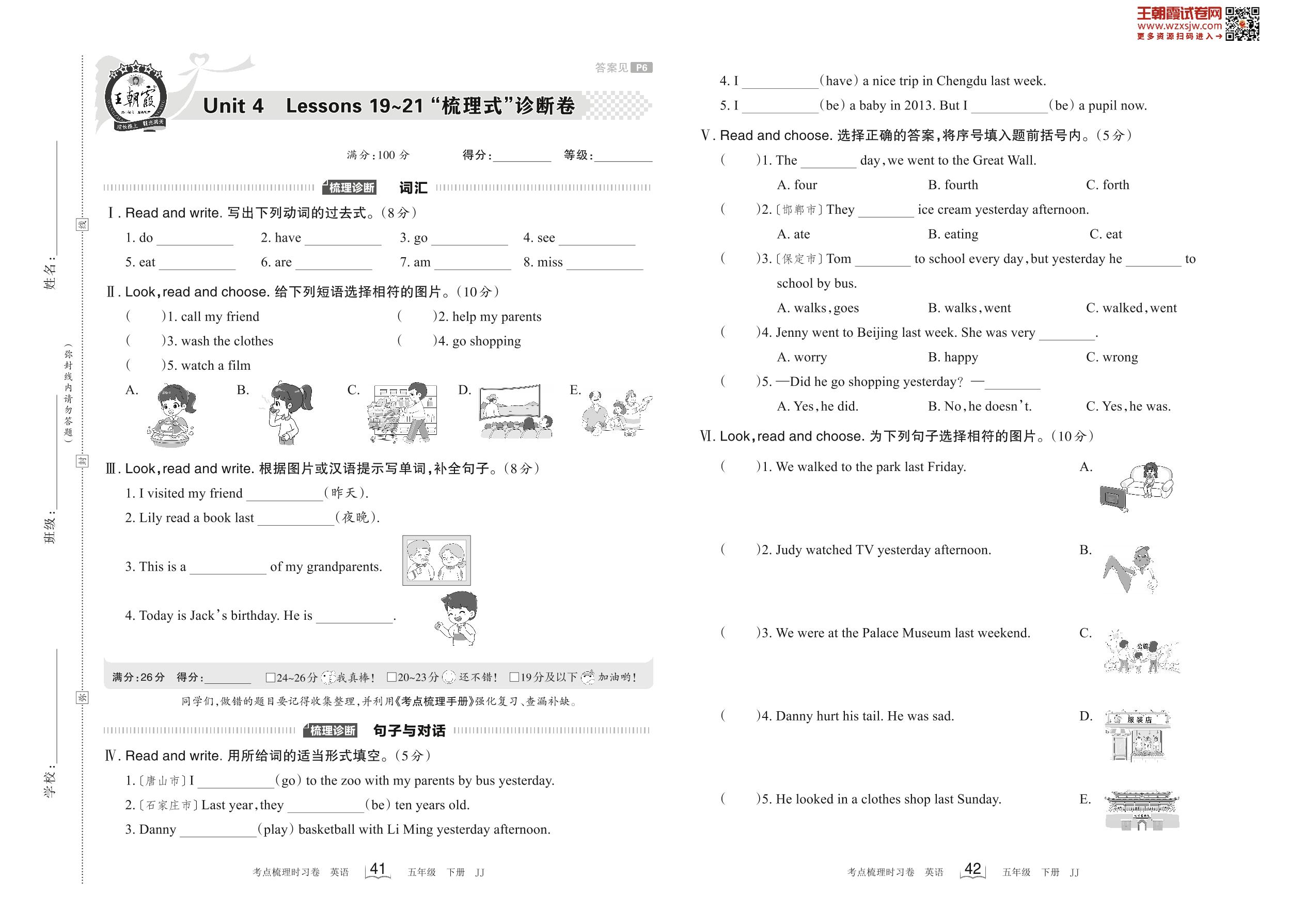 2023下册五年级英语冀教版 Unit 4 Lessons 19~21 “梳理式”诊断卷