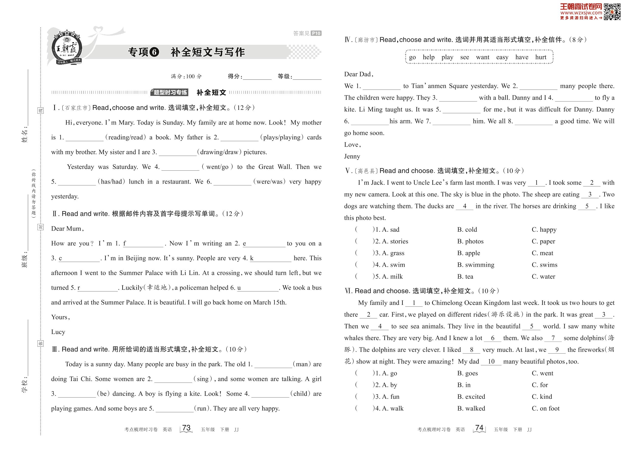2023下册五年级英语冀教版 专项6 补全短文与写作