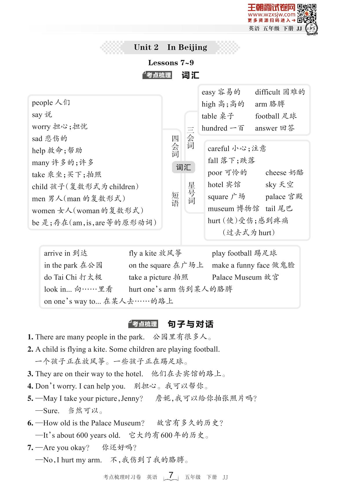 2023下册五年级英语冀教版 考点梳理手册——Unit 2 Lessons 7~9