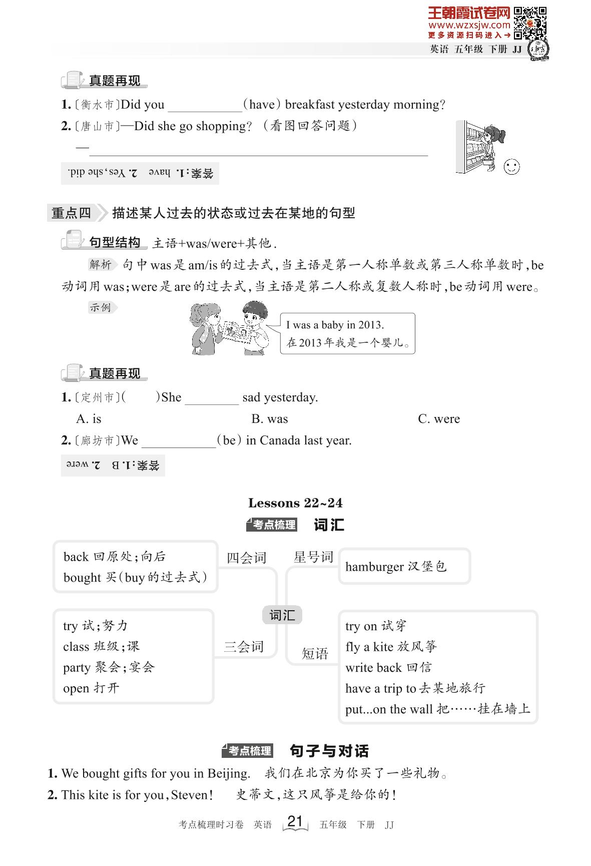 2023下册五年级英语冀教版 考点梳理手册——Unit 4 Lessons 22~24