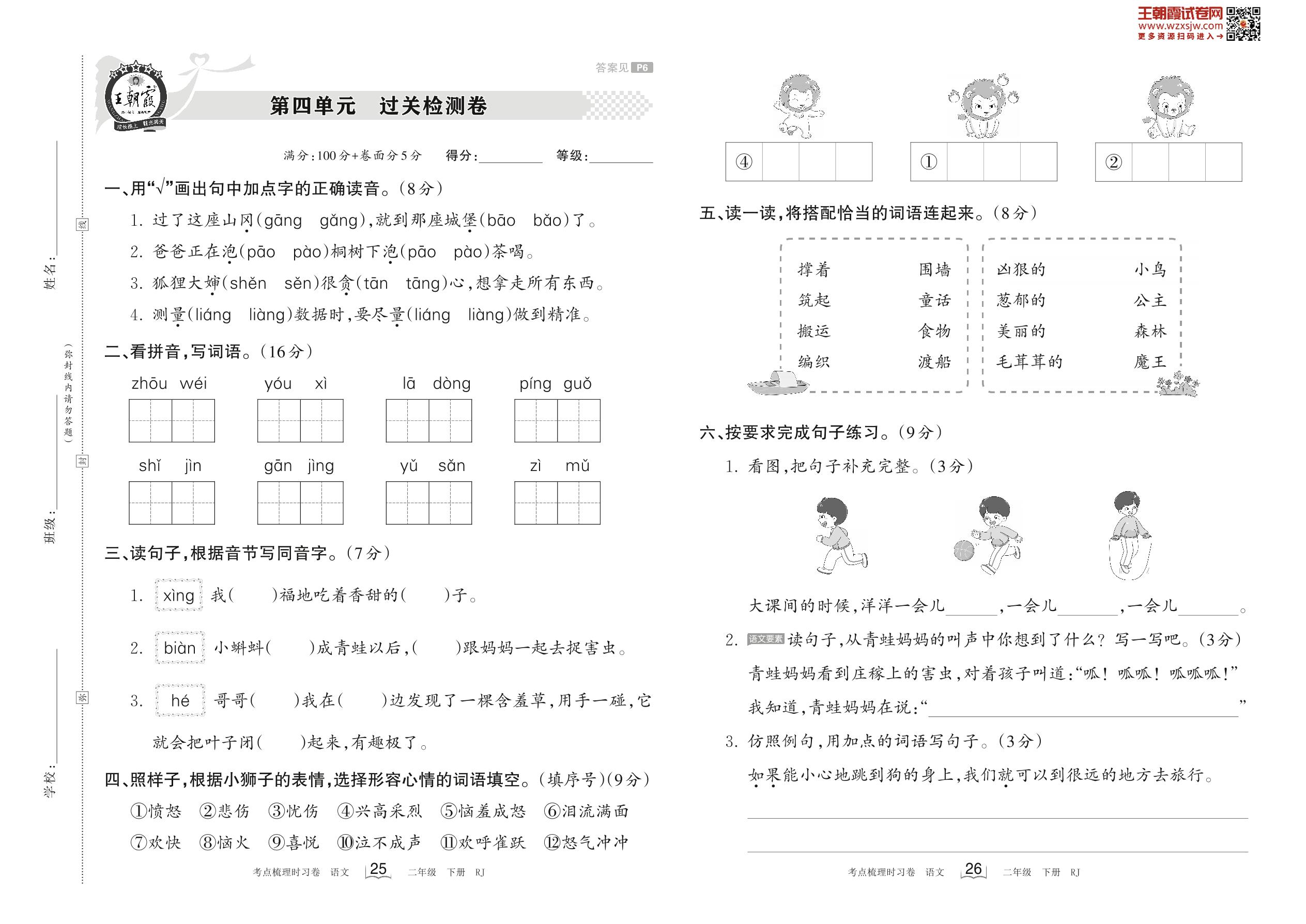 2023下册二年级语文人教版 第四单元 过关检测卷