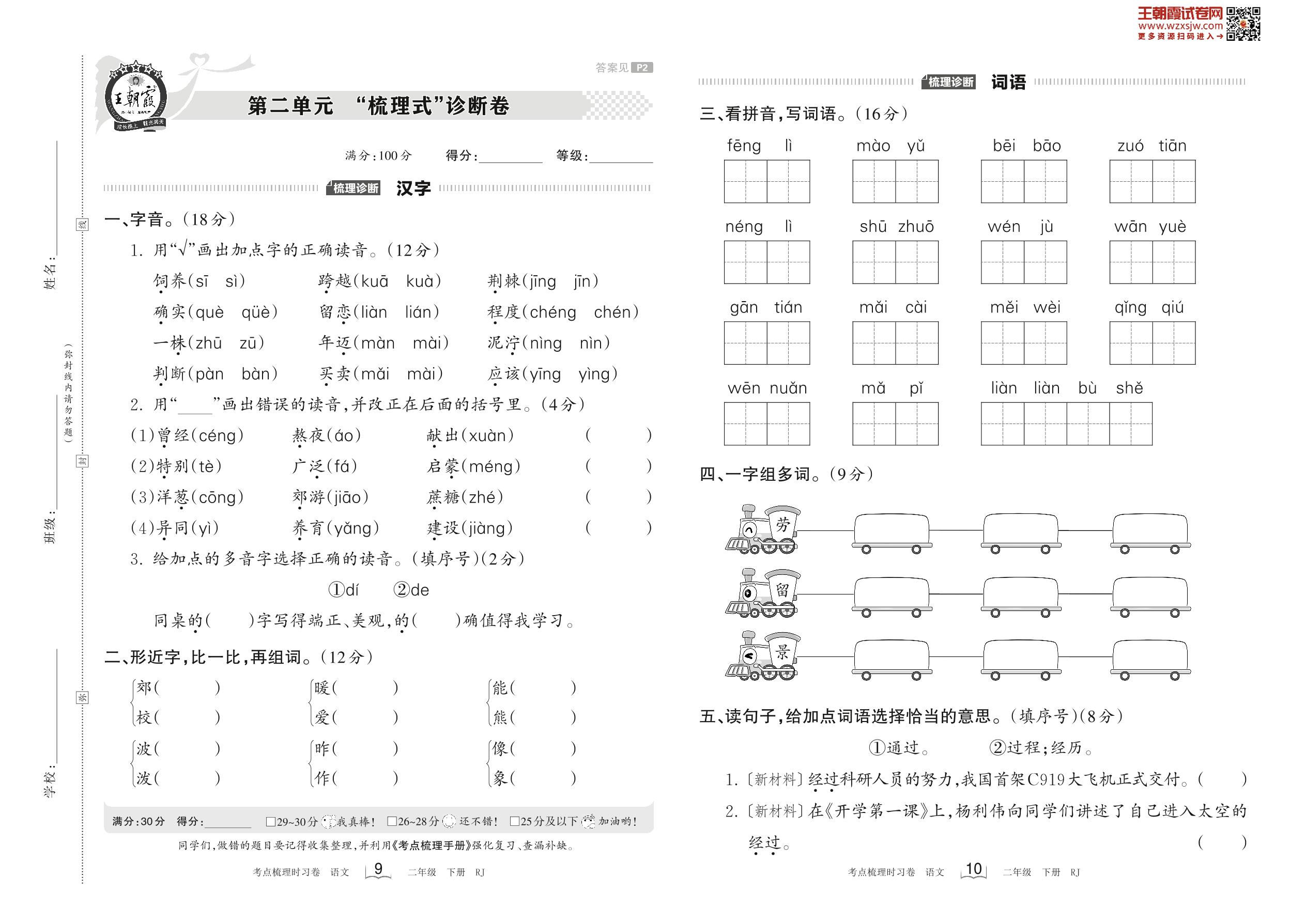 2023下册二年级语文人教版 第二单元 “梳理式”诊断卷