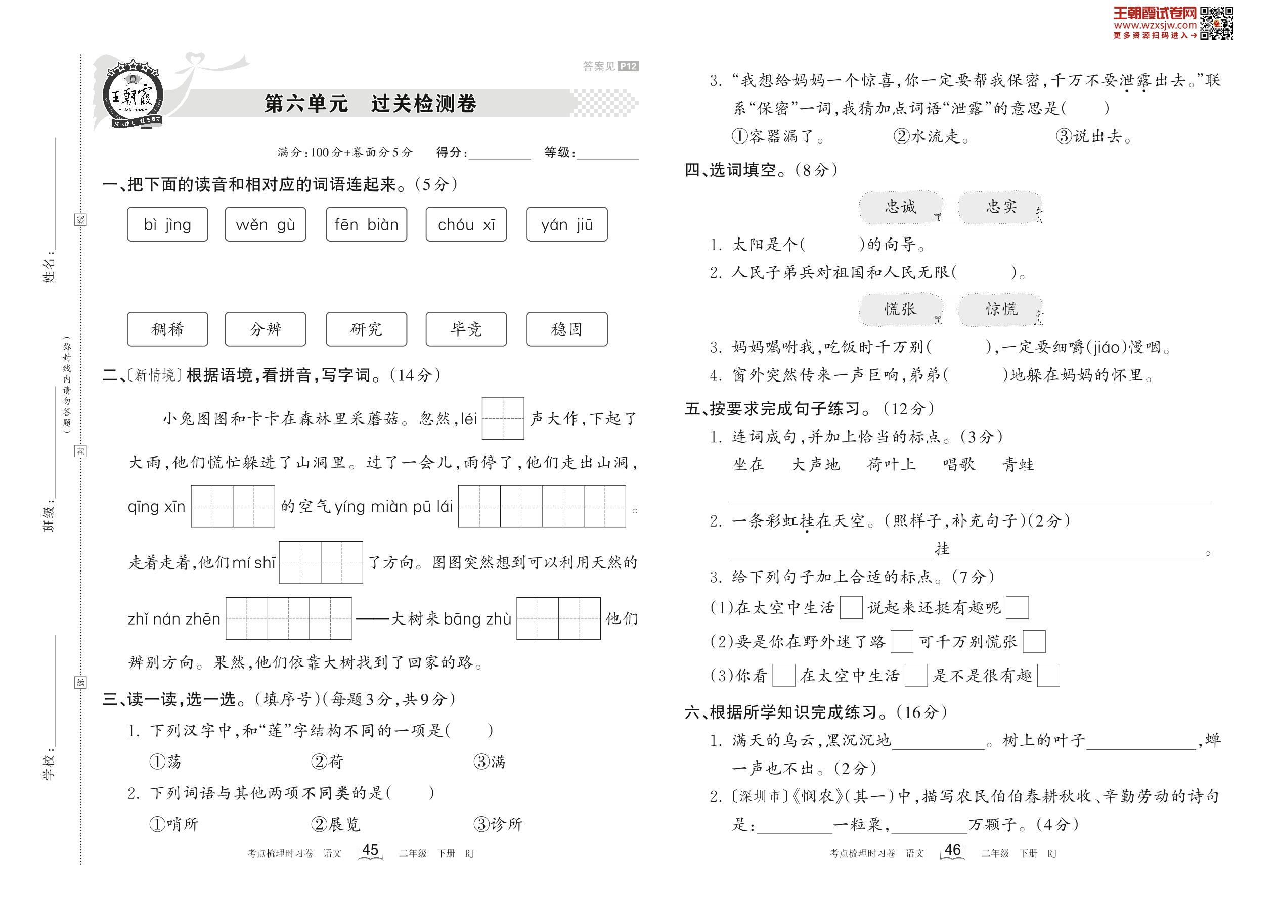 2023下册二年级语文人教版 第六单元 过关检测卷