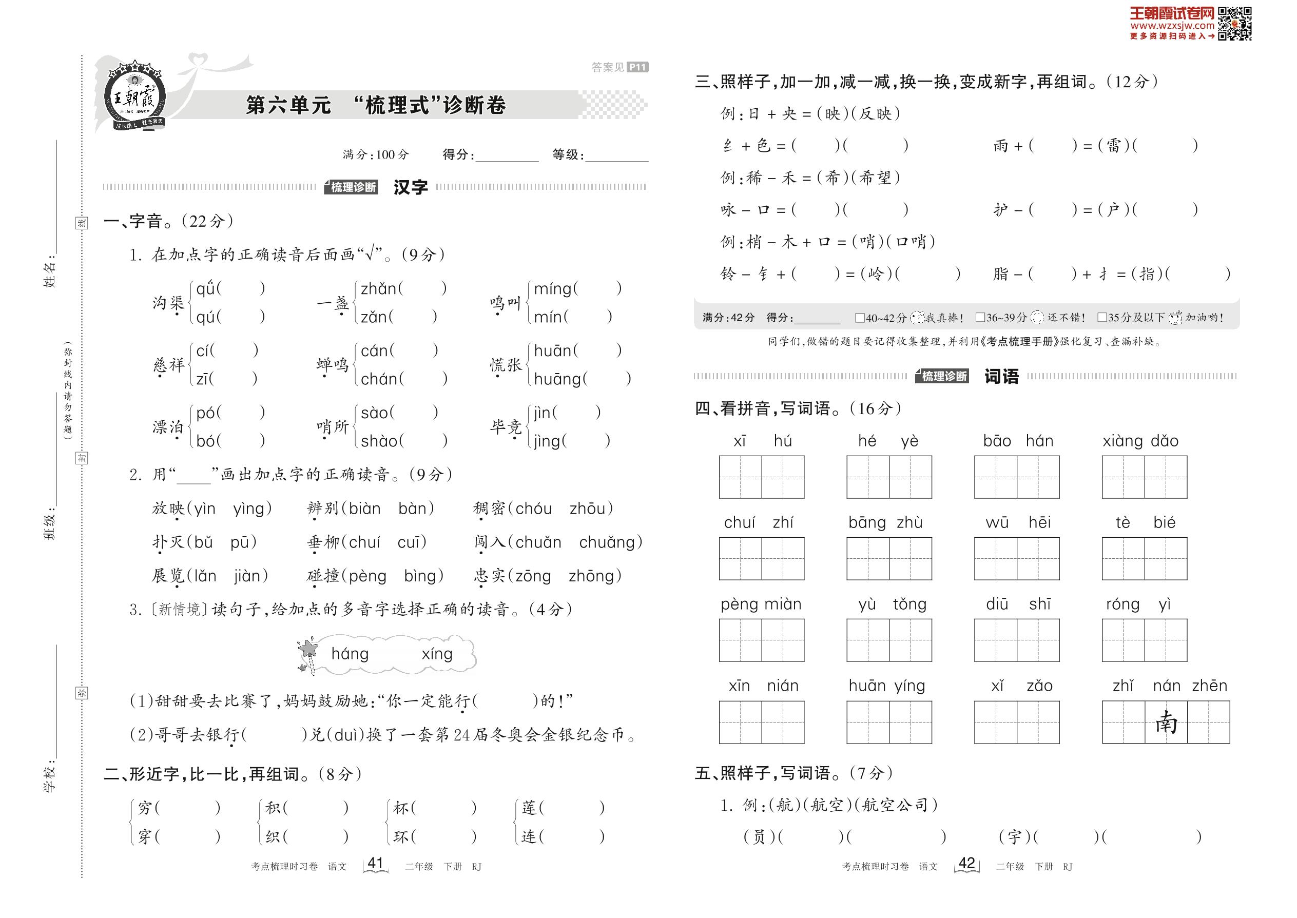 2023下册二年级语文人教版 第六单元 “梳理式”诊断卷